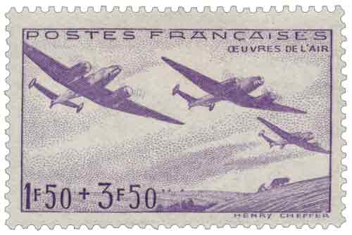 | Commentaire | Œuvres de l'air. Émis en 1942 au profit des œuvres de l'air, ce timbre a été dessiné et gravé par Henry Cheffer. Il illustre trois avions en vol, dont l'identification a fait l'objet de débats d'experts. Si certains catalogues ont pu évoquer le bombardier Lioré et Olivier LeO-451, des analyses techniques et des témoignages de pilotes de guerre indiquent qu'il s'agirait plus probablement du Potez 63-11, un avion de reconnaissance triplace. Un détail visuel soutient cette thèse : la présence de la roue arrière visible en vol, caractéristique propre au Potez. |