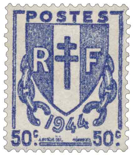 | Commentaire | Émis en France en 1945, le timbre gommé Chaînes brisées à 50 centimes violet-foncé appartient à une série courante conçue pour accompagner la normalisation des services postaux après la Libération, sa valeur faciale correspondant à l’affranchissement de l’imprimé pour l’étranger au premier échelon de poids, usage qui s’inscrit dans la reprise des échanges internationaux ; cette émission prend place au sein d’une série homogène diffusée sur l’ensemble du territoire, caractérisée par une production en typographie rotative permettant des volumes importants, tandis que son motif symbolique s’intègre au contexte institutionnel de 1945 et à la continuité graphique des valeurs courantes françaises, l’une des particularités consensuelles de cette série étant le rétablissement de la mention « RF » sur les timbres de France après la période précédente. |