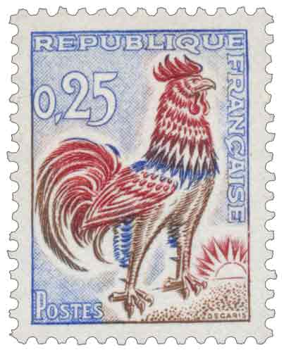 | Commentaire | Voir la vidéo "Histoires de timbres" Émis en mars 1962, le timbre dit « Coq de Decaris » à 0,25 franc s’inscrit dans la longue tradition iconographique du coq comme symbole de la France, associant identité nationale, vigilance et continuité républicaine dans le cadre de l’usage courant. Gravé en taille-douce par Albert Decaris, figure majeure de la gravure française du XXᵉ siècle, ce timbre prolonge une esthétique volontairement classique et lisible, adaptée à une diffusion massive et quotidienne, tout en conservant une forte présence symbolique. Son émission intervient dans un contexte de modernisation des services postaux, marqué notamment par des expérimentations techniques liées au traitement mécanique du courrier : certaines feuilles furent imprimées sur papier fluorescent afin de tester le redressage automatique des enveloppes, une innovation alors encore expérimentale. Ces essais, rapidement interrompus, confèrent aujourd’hui à certaines variétés une place particulière dans l’étude philatélique de cette émission, sans remettre en cause sa vocation première de timbre utilitaire largement diffusé. Par son très long maintien en vente et son tirage considérable, ce timbre illustre la stabilité recherchée par l’administration postale française au début des années 1960, tout en constituant un jalon important dans l’histoire des usages courants et des évolutions techniques de l’acheminement du courrier. Article rédigé pour WikiTimbres |