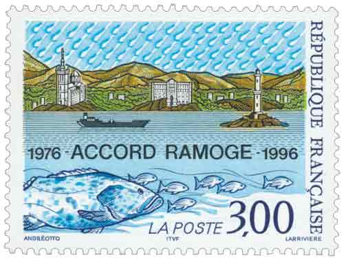 | Description | 20e anniversaire de l'Accord RAMOGE (lutte contre la pollution des côtes). Émission conjointe avec l'Italie et Monaco, représentation d'un paysage littoral méditerranéen |