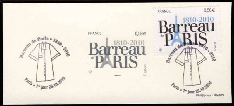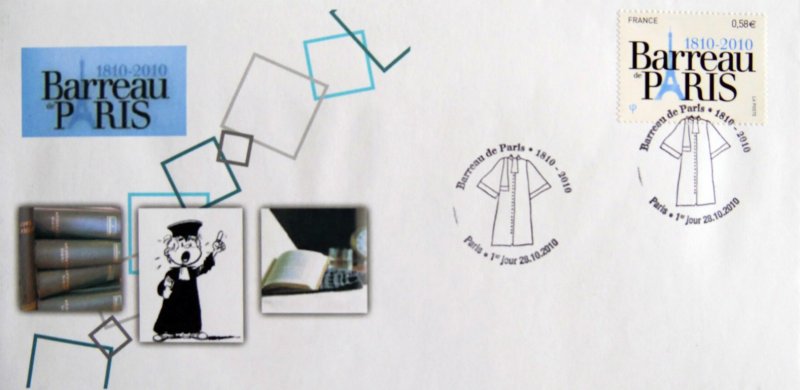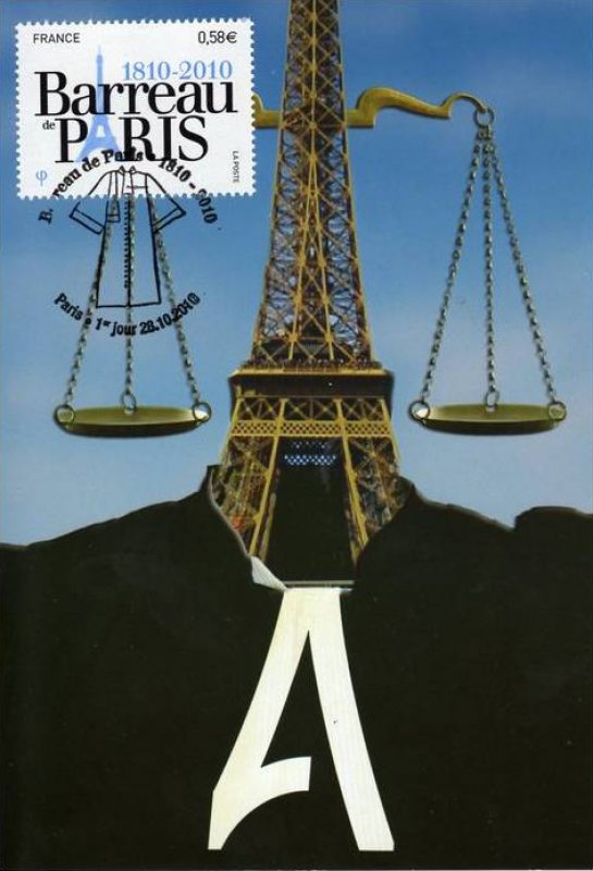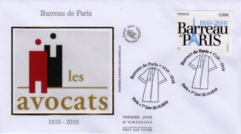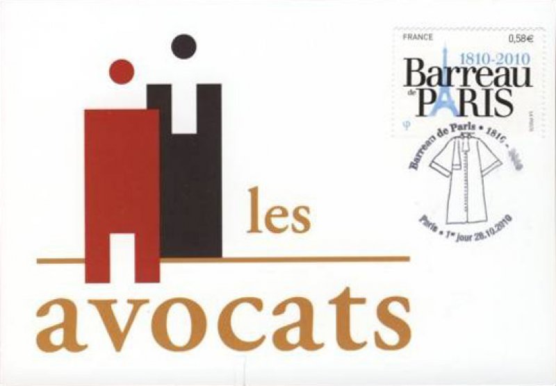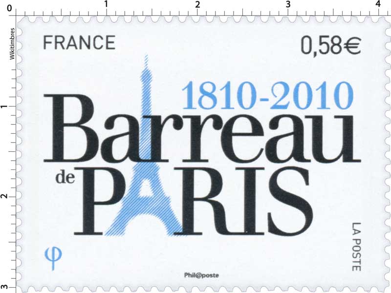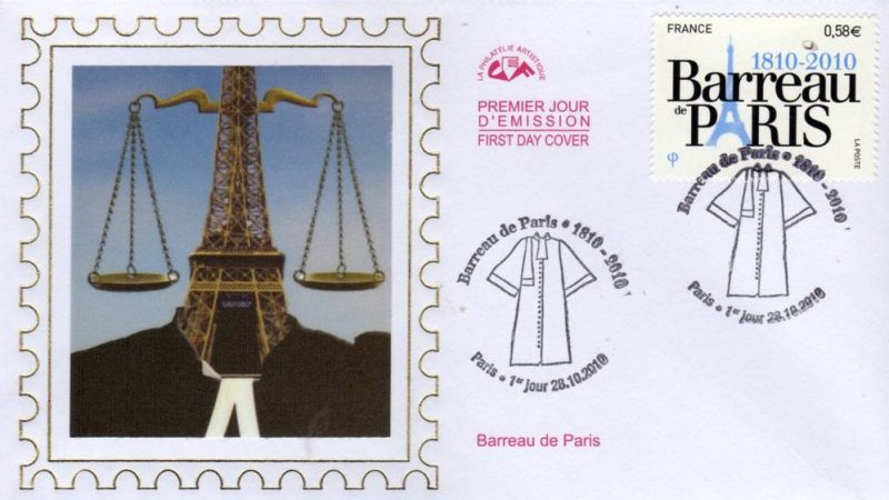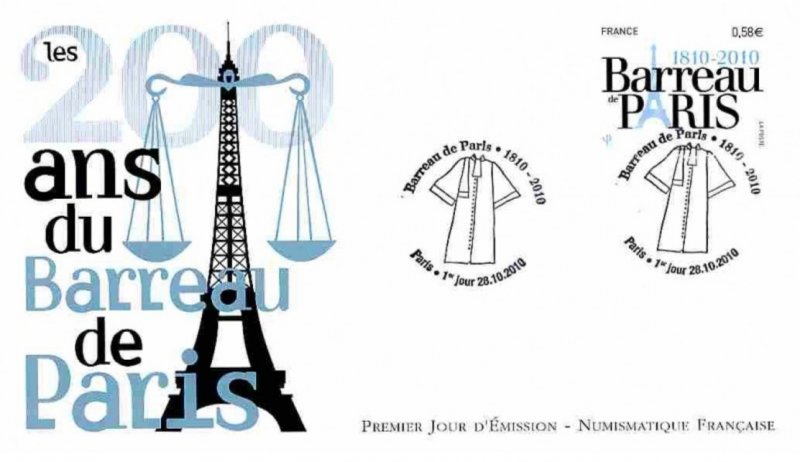 | Commentaire | Existe également en autoadhésif. La Poste émet un timbre commémorant le bicentenaire de la création du barreau de Paris. INFOS PRATIQUES PREMIER JOUR : 28 octobre 2010 Vente Anticipée : à Paris (Carré d’Encre) conçu par l’Atelier Thimonier |