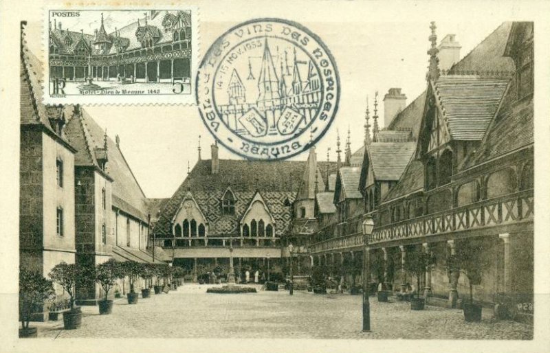 | Commentaire | Visuel : la cour intérieure, de style gothique flamboyant, avec ses toitures polychromes en tuiles vernissées de Bourgogne et leurs lucarnes aériennes, fondé par Nicolas Rollin (1376-1462, chancelier de Philippe le Bon, duc de Bourgogne) et son épouse Guigone de Salins (1403-1470). |