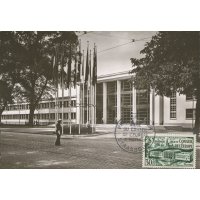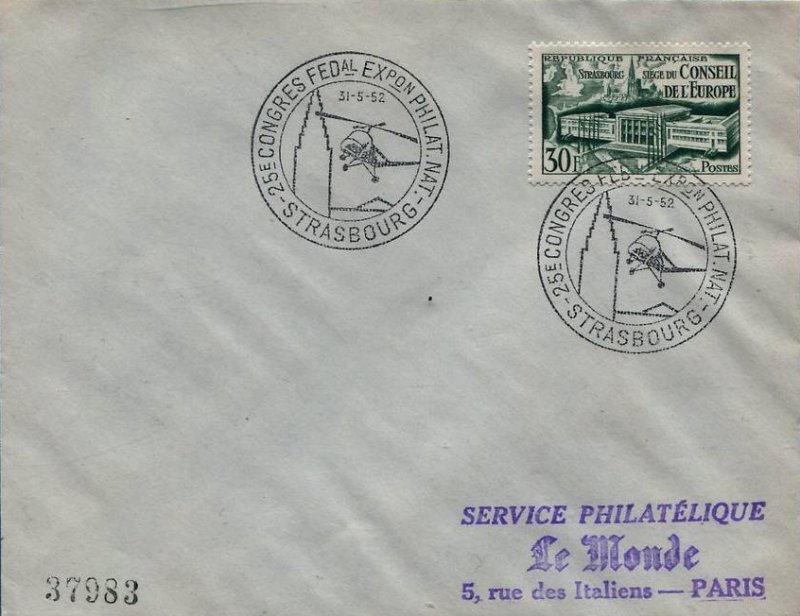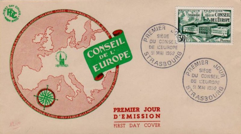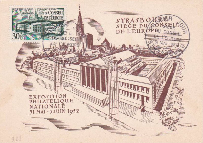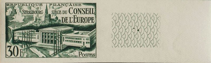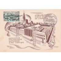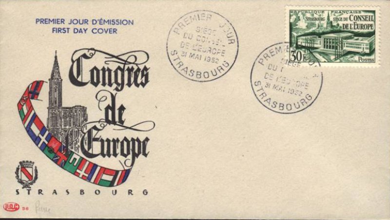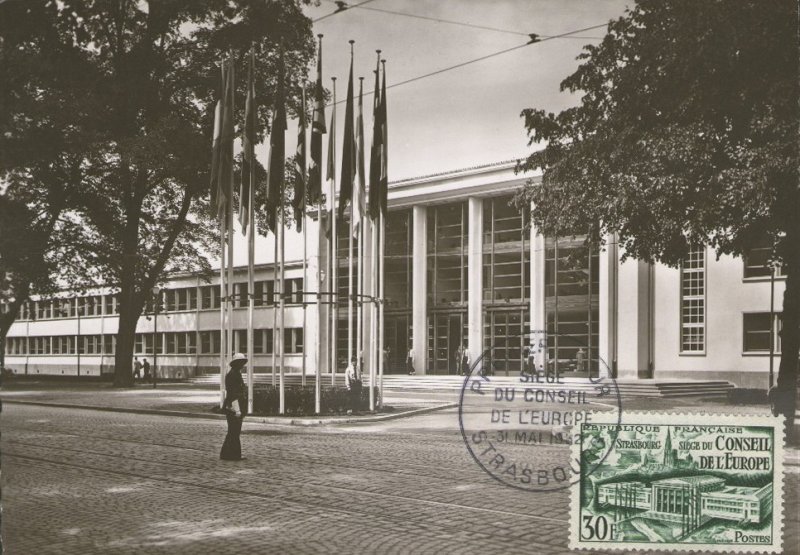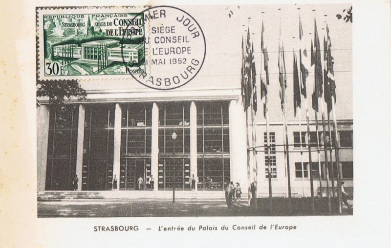 Visuel : la "Maison de l'Europe", conçue par l'architecte Bertrand Monnet (1910-1989), une vision de la ville de Strasbourg et sa Cathédrale, sur fond de carte de l'Europe. Elle a été détruite en 1977, et se trouvait à la place de l'actuelle pelouse menant au Palais de l'Europe.