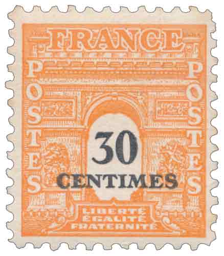 | Commentaire | Le timbre gommé de 1945 « Arc de Triomphe de Paris » à 30 centimes orange et noir appartient à la 4ᵉ série du Gouvernement provisoire et s’inscrit dans la continuité directe des émissions de 1944, conçues pour accompagner la remise en ordre des services postaux français après la Libération. Mis en vente en février 1945, il correspond à une tentative d’adaptation rapide aux tarifs postaux alors en vigueur, notamment pour l’affranchissement des journaux, usage auquel il était principalement destiné. Cette série se distingue philatéliquement par l’impression en noir d’une nouvelle valeur faciale lors d’un second passage, procédé destiné à corriger l’inadéquation tarifaire de la série précédente, mais rendu presque caduc par un changement de tarifs intervenu seulement trois semaines après sa diffusion. Le choix de l’Arc de Triomphe, monument emblématique de Paris et de la mémoire nationale, s’inscrit dans une iconographie consensuelle et fédératrice, caractéristique des émissions françaises de l’immédiat après-guerre. Dessiné par William A. Roach d’après une photographie conservée à la bibliothèque municipale de Washington et gravé par une équipe de graveurs américains, ce timbre illustre également le contexte particulier de coopération internationale qui marque la période 1944-1945. |