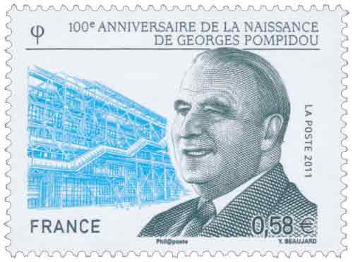 | Commentaire | Georges Pompidou est né à Montboudif dans le Cantal le 5 juillet 1911. Agrégé de lettres, il enseigne à Marseille, puis au Lycée Henri IV à Paris. En 1958, il devient le directeur de Cabinet de Charles de Gaulle. Premier ministre de 1962 à 1968, il réaménage le territoire français en créant la DATAR, crée les préfets de région, réforme la sécurité sociale… Élu Président de la République le 20 juin 1969, il poursuit la modernisation de la France. Amateur d’art, tout comme son épouse, il est l'initiateur du Centre National d'Art et de Culture Georges Pompidou à Paris, oeuvre des architectes Renzo Piano et Richard Rogers, dont la façade est ici représentée sur le fond du timbre.