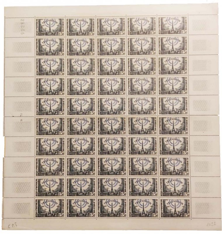 | Commentaire | Voir la vidéo "Histoires de timbres" Émis en 1955, le timbre-poste français consacré à la télévision illustre l’entrée de ce média dans la vie quotidienne et s’inscrit dans une politique philatélique attentive aux grandes innovations techniques du XXᵉ siècle, la figurine gravée en taille-douce et imprimée en format horizontal mettant en scène l’essor de la diffusion télévisuelle en France, symbolisée par un réseau d’émission rayonnant depuis la Tour Eiffel, site emblématique des premières installations d’émetteurs parisiens, tandis que l’émission rappelle les étapes majeures du développement technique, des expérimentations de la fin du XIXᵉ siècle aux premières émissions régulières puis à la constitution progressive d’un réseau national après 1944, l’usage postal étendu de ce timbre correspondant à l’affranchissement de la lettre simple et de divers envois spécifiques, et sa place dans les émissions de 1955 soulignant l’importance accordée par la France à la modernisation des télécommunications et à la diffusion des images, une information historiquement établie étant que l’Exposition internationale de Paris de 1937 marqua une étape décisive avec la présentation d’un système français à haute définition pour l’époque. |