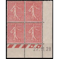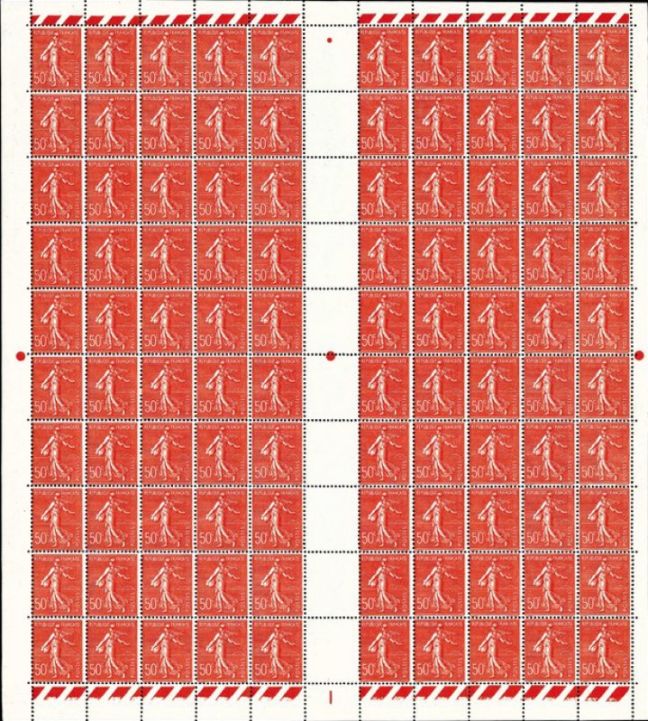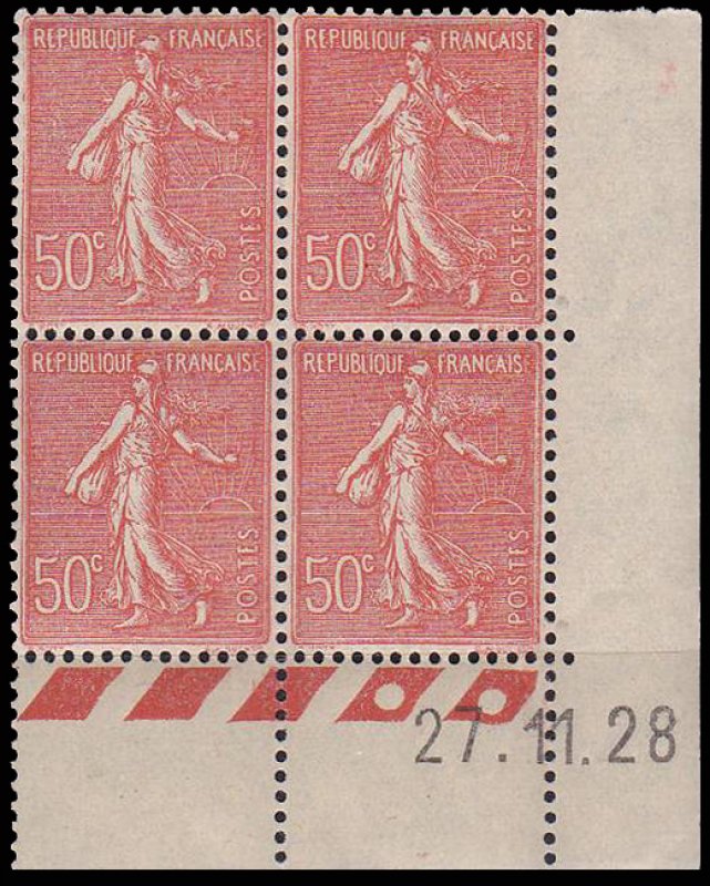 | Commentaire | Semeuse lignée. Type IIA. Nota Les ombres portées sur la Semeuse sont mal positionnées par rapport au soleil, de plus elle sème contre le vent Mis en circulation en septembre 1926, ce 50 centimes rouge du type Semeuse lignée s’inscrit dans les dernières émissions de cette grande série d’usage courant. Gravé par Louis-Eugène Mouchon d’après l’allégorie d’Oscar Roty, il reprend la figure emblématique de La Semeuse semant à contre-vent, posée sur un fond caractérisé par les lignes horizontales et le soleil à l’horizon, éléments distinctifs du type ligné. Imprimé en typographie, dentelé 14 × 13½ et tiré en feuilles de 100, il adopte le format standard de la série : 20 × 24 mm (vignette 18 × 22 mm). La couleur rouge, plus vive que les valeurs d’avant 1925, en fait un timbre représentatif de l’évolution chromatique des émissions tardives. Retiré progressivement de la vente entre 1928 et 1932, il est aujourd’hui un timbre courant simple mais incontournable pour compléter une étude spécialisée des émissions Semeuse lignée.