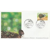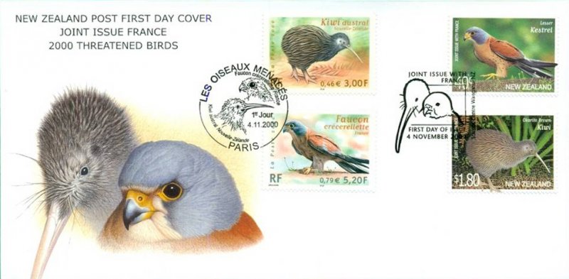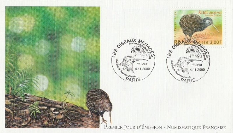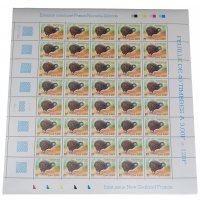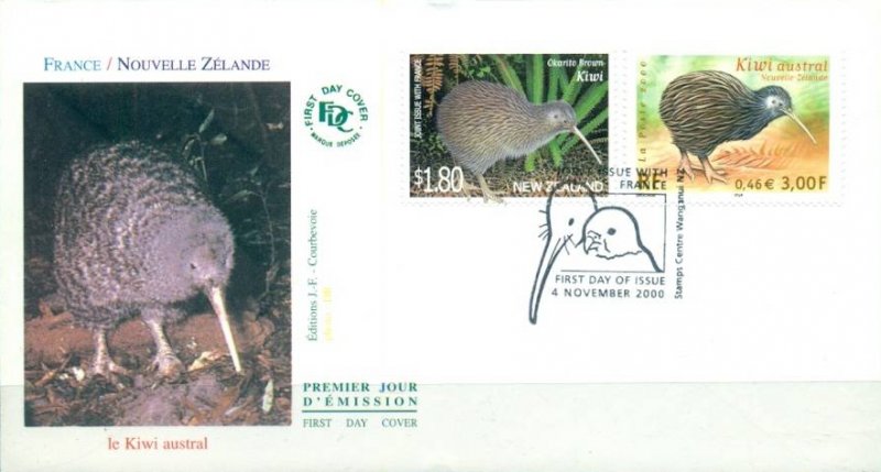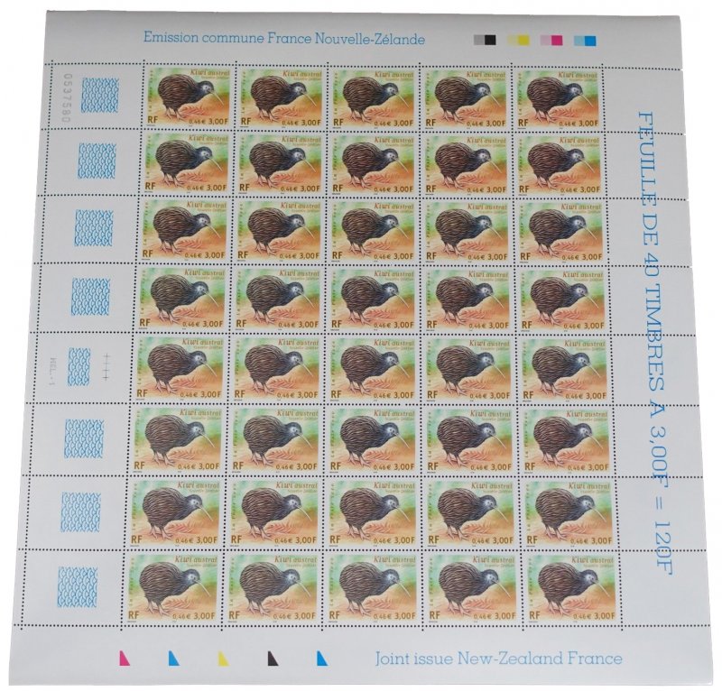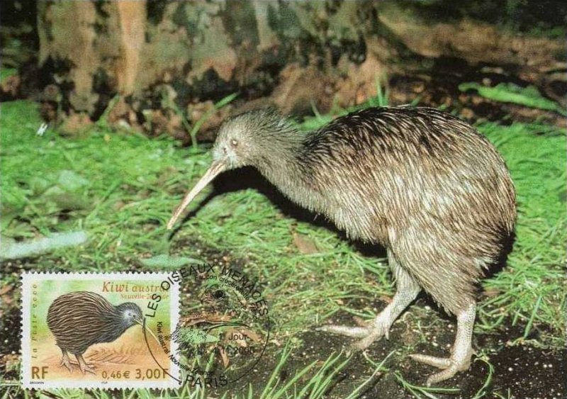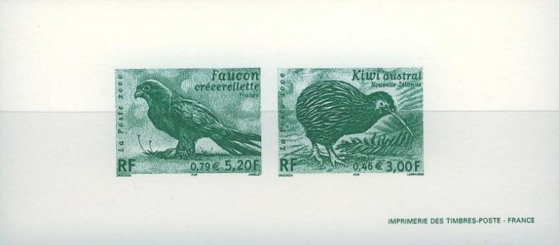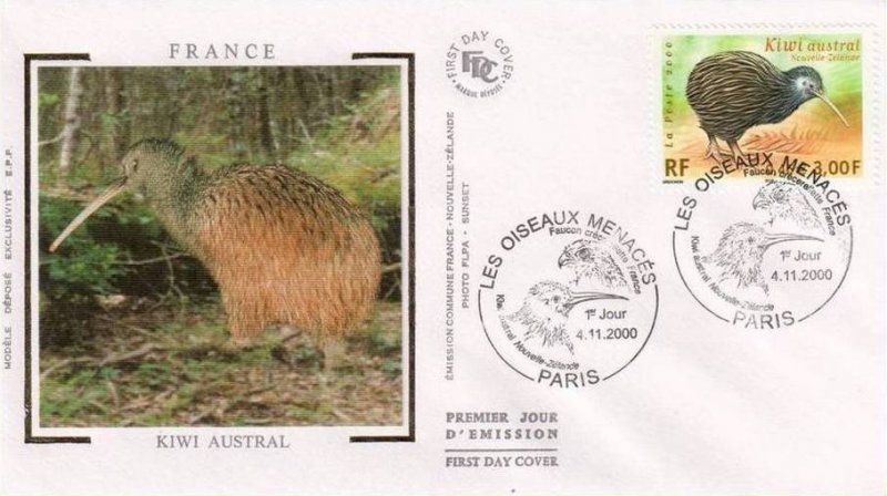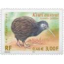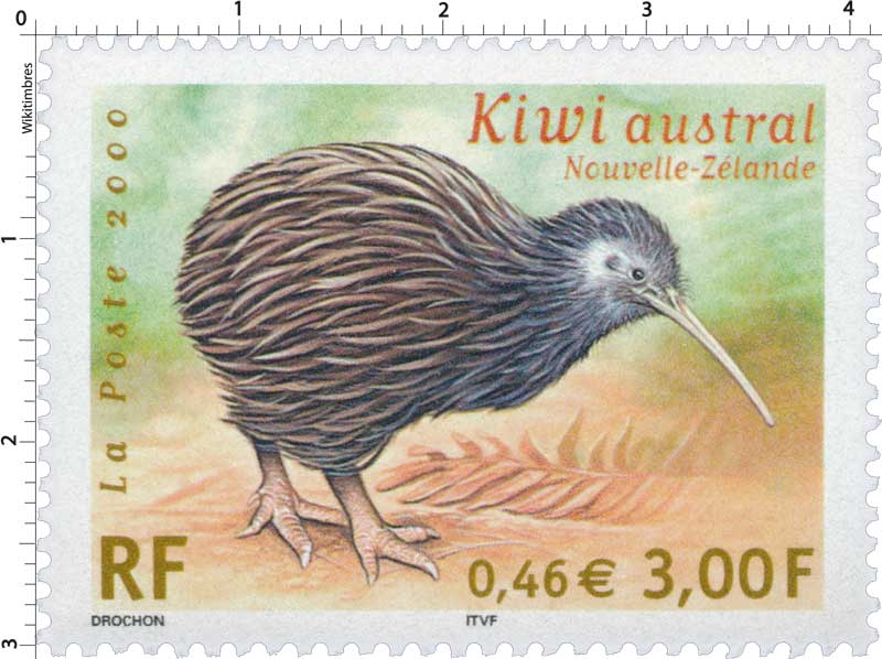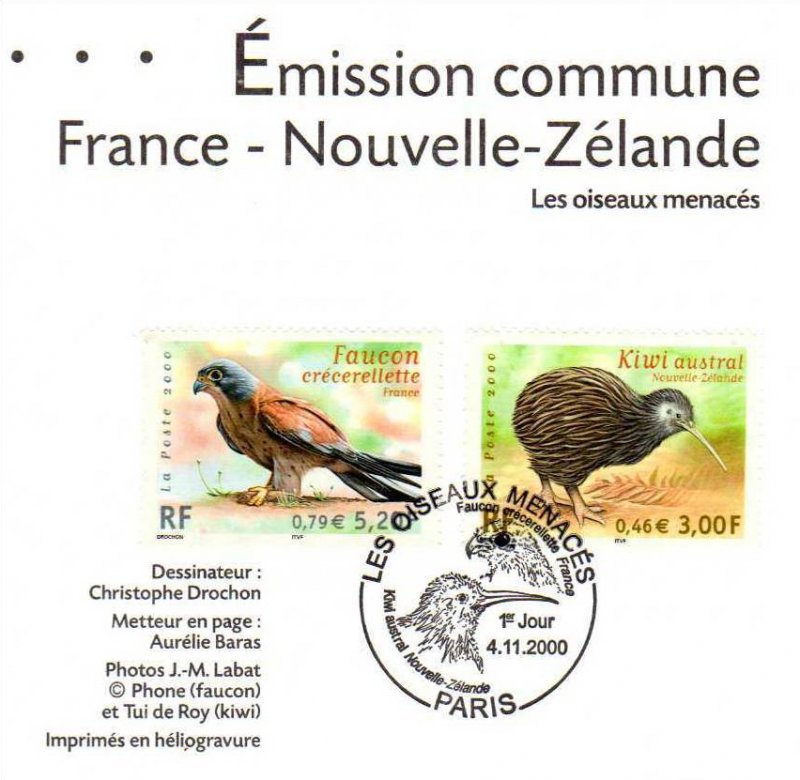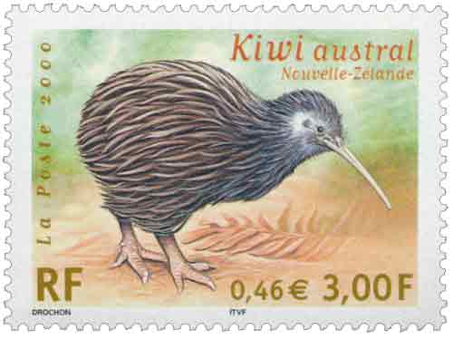 | Commentaire | Description synthétique du visuel du timbre : Les oiseaux se trouvent souvent au sommet des chaînes alimentaires, ce qui les rend sensibles aux perturbations des écosystèmes. Pour cette raison, ils sont devenus les indicateurs de santé de notre environnement et les effectifs d’une espèce traduisent le bon état ou au contraire l’altération des milieux naturels. L’avenir des espèces menacées est une préoccupation commune à la Nouvelle-Zélande et à la France. Pour cette raison deux oiseaux ont été retenus pour illustrer l’émission commune de l’année 2000. Oiseau nocturne, muni d’ailes mais ne volant pas, le kiwi ne s’apparente à aucun autre oiseau. Il est l’emblème de la Nouvelle-Zélande. 3 espèces vivent en Nouvelle-Zélande. Le kiwi austral (Apterys australis) mesure 55 cm de long et se nourrit d’invertébrés qu’il repère grâce à son odorat. Émission commune avec la Nouvelle-Zélande |