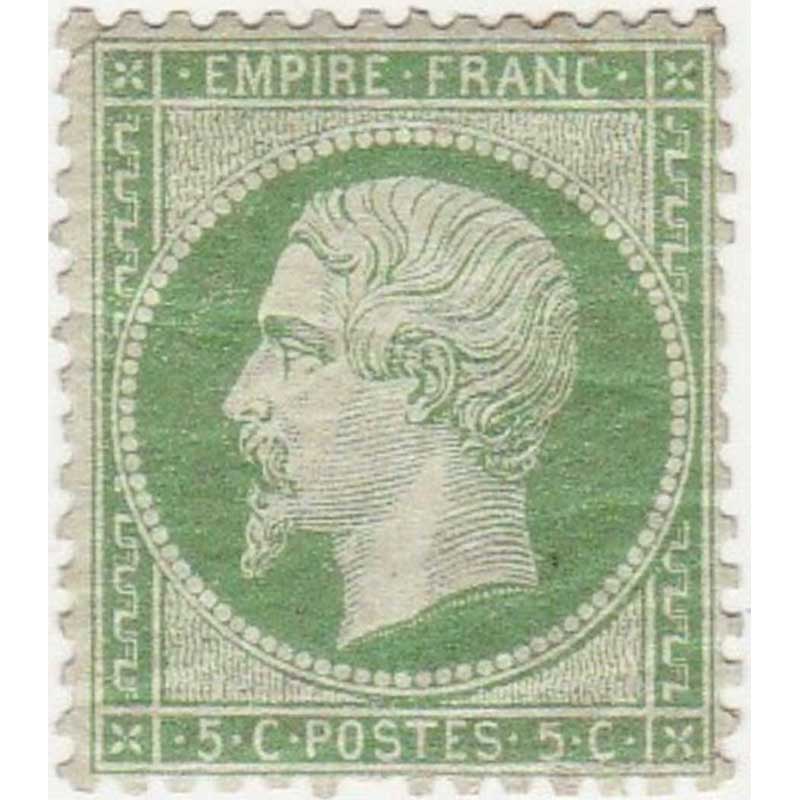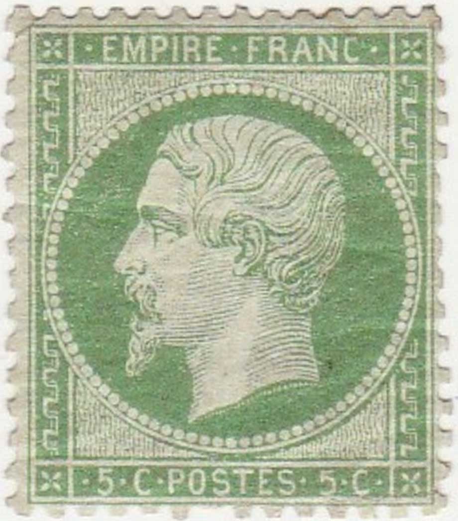 | Commentaire | Napoléon III - Empire Franc, dentelé. Émis le 23 août 1862, le 5 centimes vert au type Napoléon III – Empire non lauré marque, comme toute la série de 1862, l’entrée définitive de l’administration postale française dans l’ère de la dentelure en ligne, alors appelée « pointillage ». Cette valeur remplace directement le 5 c non dentelé de 1854 (YT n°12), utilisé pour affranchir faire-part, cartes de visite et imprimés circulant dans le même arrondissement postal. Comme pour les autres valeurs dentelées de 1862, le matériel d’impression reste inchangé : mêmes planches, mêmes encres, mêmes papiers que les tirages non dentelés du type Empire. La dentelure n’est qu’une opération additionnelle réalisée après l’impression, ce qui explique que l’administration classe à l’époque les versions dentelées et non dentelées comme un seul et même timbre. Les collectionneurs doivent donc distinguer les deux états uniquement par la présence (souvent irrégulière) de la perforation. Le profil impérial est celui du type dit non lauré, sans couronne de laurier, accompagné de la légende EMPIRE FRANC, adoptée après la proclamation officielle de l’Empire en 1852. Bien que très courant dans les correspondances du XIXᵉ siècle, le 5 c dentelé constitue une pièce importante pour comprendre la transition technique majeure de 1862 et l’évolution des usages postaux pour les imprimés légers.