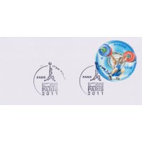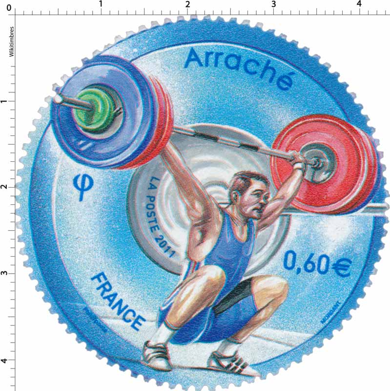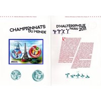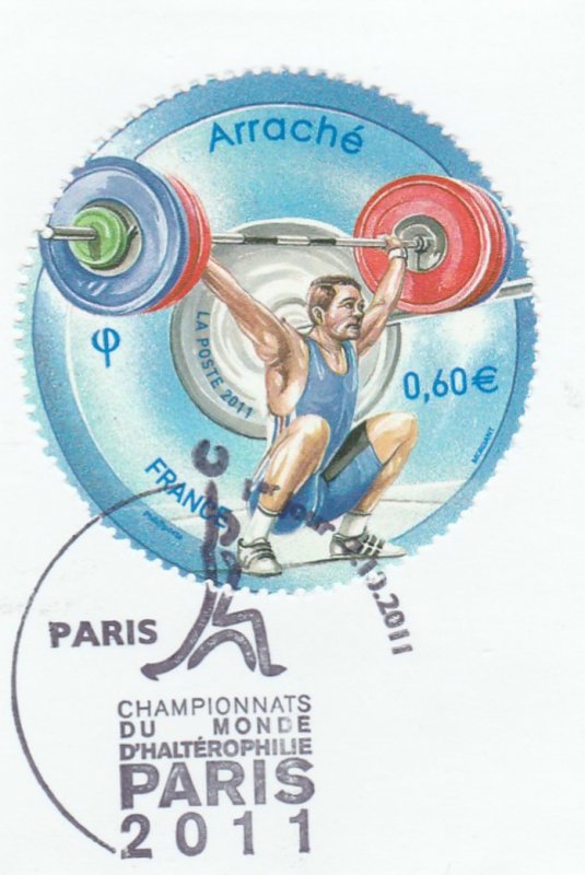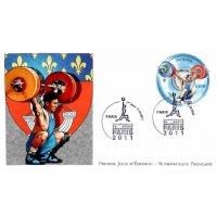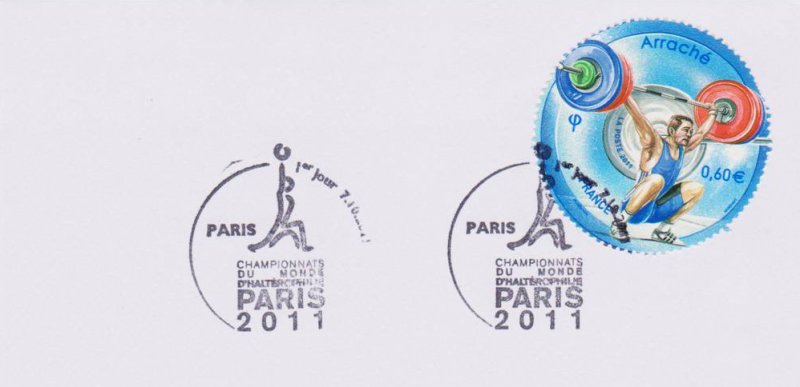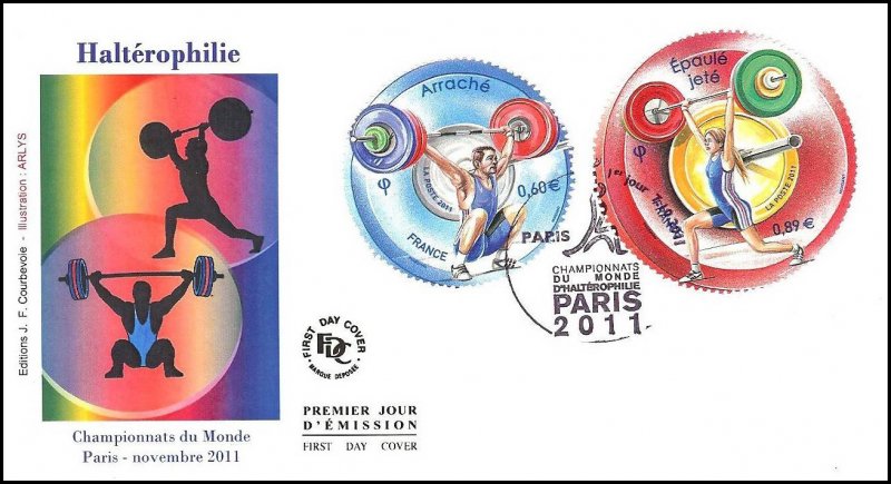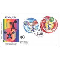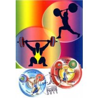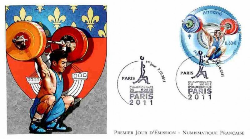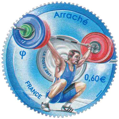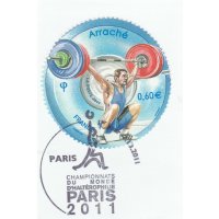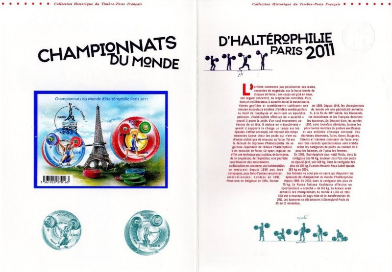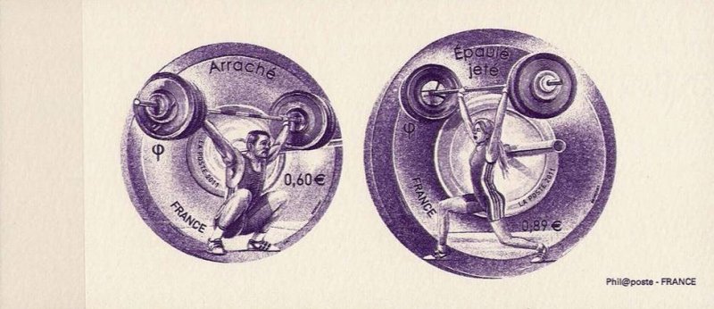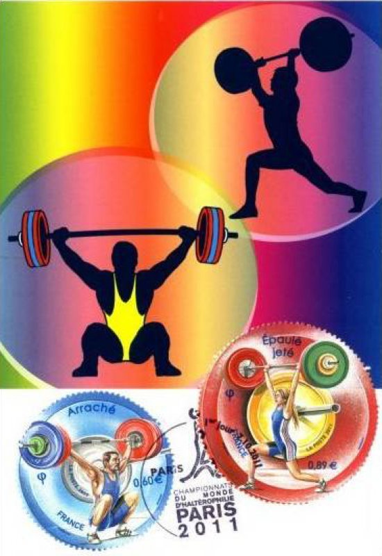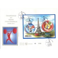 | Commentaire | Les Championnats du Monde d’Haltérophilie se déroulent du 5 au 13 novembre à Disneyland Paris. À l’occasion de cette manifestation, La Poste édite un bloc de 2 timbres représentant 2 athlètes, une femme et un homme en tenue de l’équipe de France, chacun réalisant un mouvement différent, un arraché pour l’athlète masculin dont la phase technique du mouvement correspond à la réception, un épaulé jeté pour l’athlète féminine en phase de passage en fente. En fond, la Tour Eiffel pour symboliser la ville où se déroule la compétition.