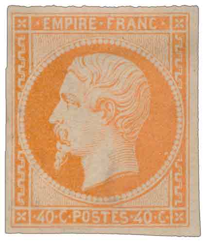| Commentaire | Napoléon III - Empire Franc. Retrait fin 1862 Émis en septembre 1853, le 40 centimes orange est la première valeur de cette faciale au type Napoléon III. Aucun 40 c n’avait été créé au type « Présidence » : jusqu’à cette date, c’est le 40 c Cérès de 1850 qui continuait d’assurer l’affranchissement correspondant. Cette nouvelle émission impériale vient donc remplacer directement la dernière valeur encore utilisée de la série Cérès. Le timbre reprend le poinçon retouché par Jean-Jacques Barre après la décision de janvier 1853 de modifier la légende. La mention « EMPIRE FRANC », adoptée après la proclamation de Napoléon III, remplace désormais « REPUB FRANC », et l’initiale « B » du graveur, visible sur les émissions antérieures, disparaît sous le cou de l’effigie. Le dessin présente le profil gauche de Napoléon III dans un médaillon entouré du cadre ornemental caractéristique des premières émissions impériales. Imprimé en typographie et non dentelé, le 40 c orange connaît un tirage très important, proche de 59 millions d’exemplaires, reflétant son rôle essentiel pour les affranchissements plus lourds ou les correspondances à destination de l’étranger, conformément aux tarifs en vigueur avant la réforme du 25 mai 1854. Cette réforme, qui abaisse plusieurs tarifs, rend le 40 c moins central mais il reste utilisé jusqu’à l’introduction des tirages dentelés à partir de 1862. Les oblitérations les plus courantes sont le losange Petits Chiffres et, à Paris, l’étoile muette, conformément aux règles appliquées depuis 1852. Cette valeur constitue ainsi l’un des principaux timbres d’usage courant du début du Second Empire, marquant la fin de l’utilisation postale des dernières Cérès pour les affranchissements élevés.