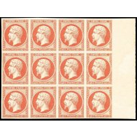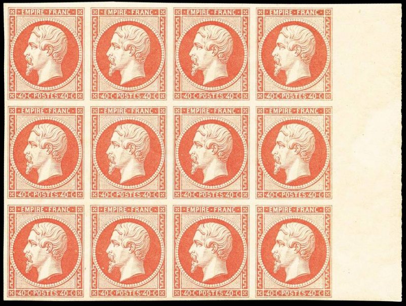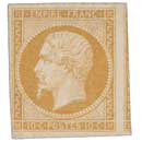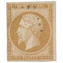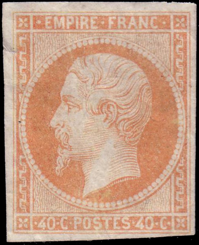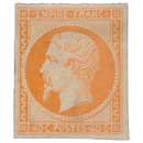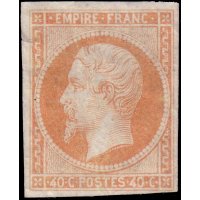 | Commentaire | Napoléon III - Empire Franc. Retrait fin 1862 Émis en septembre 1853, le 40 centimes orange est la première valeur de cette faciale au type Napoléon III. Aucun 40 c n’avait été créé au type « Présidence » : jusqu’à cette date, c’est le 40 c Cérès de 1850 qui continuait d’assurer l’affranchissement correspondant. Cette nouvelle émission impériale vient donc remplacer directement la dernière valeur encore utilisée de la série Cérès. Le timbre reprend le poinçon retouché par Jean-Jacques Barre après la décision de janvier 1853 de modifier la légende. La mention « EMPIRE FRANC », adoptée après la proclamation de Napoléon III, remplace désormais « REPUB FRANC », et l’initiale « B » du graveur, visible sur les émissions antérieures, disparaît sous le cou de l’effigie. Le dessin présente le profil gauche de Napoléon III dans un médaillon entouré du cadre ornemental caractéristique des premières émissions impériales. Imprimé en typographie et non dentelé, le 40 c orange connaît un tirage très important, proche de 59 millions d’exemplaires, reflétant son rôle essentiel pour les affranchissements plus lourds ou les correspondances à destination de l’étranger, conformément aux tarifs en vigueur avant la réforme du 25 mai 1854. Cette réforme, qui abaisse plusieurs tarifs, rend le 40 c moins central mais il reste utilisé jusqu’à l’introduction des tirages dentelés à partir de 1862. Les oblitérations les plus courantes sont le losange Petits Chiffres et, à Paris, l’étoile muette, conformément aux règles appliquées depuis 1852. Cette valeur constitue ainsi l’un des principaux timbres d’usage courant du début du Second Empire, marquant la fin de l’utilisation postale des dernières Cérès pour les affranchissements élevés.