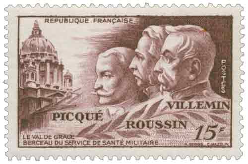 | Commentaire | Émis par la France en juin 1951, ce timbre gommé consacré à la médecine militaire s’inscrit dans la tradition des émissions thématiques valorisant les grandes institutions scientifiques et sanitaires nationales, en prenant pour cadre symbolique le Val-de-Grâce, établissement emblématique de la formation et de l’exercice du Service de santé des armées depuis la Révolution. Mis en vente à partir du 17 juin 1951 à Paris puis généralisé le 18 juin, il rappelle la transformation en 1793 de l’ancien couvent en hôpital militaire d’instruction, avant la création en 1850 de l’École d’application du Service de santé militaire, devenue un centre de référence pour la formation des médecins, chirurgiens et pharmaciens militaires. La composition, dessinée par Serres et gravée en taille douce par Mazelin, associe l’architecture du site à trois figures représentatives des lignées du Service de santé : le chirurgien Robert Picqué, pionnier de la chirurgie de l’avant et de l’aviation sanitaire, le pharmacien Zacharie Roussin, organisateur et chimiste à l’origine des colorants azoïques, et le médecin Antoine Villemin, dont les travaux sur la contagiosité de la tuberculose ont fondé la lutte moderne contre cette maladie. Par son iconographie et son sujet, le timbre souligne le rôle déterminant de la médecine militaire dans les progrès scientifiques, l’organisation des soins en temps de guerre et la diffusion d’innovations majeures vers la médecine civile, tout en conservant un usage postal courant. |