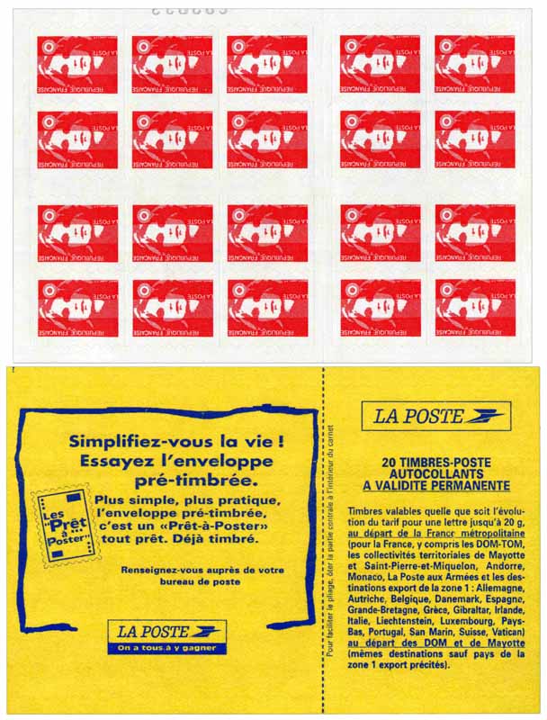 | Commentaire | Carnet pour distributeur automatique de billets de banque. Les timbres de ce carnet sont au type II, c'est le seul carnet des Mariannes du bicentenaire ou Mariannes de Briat qui porte ce type de timbre. Gravure mécanique à partir du poinçon du 4,50 francs rose de 1996. En savoir plus sur Wikipédia : Marianne du Bicentenaire |