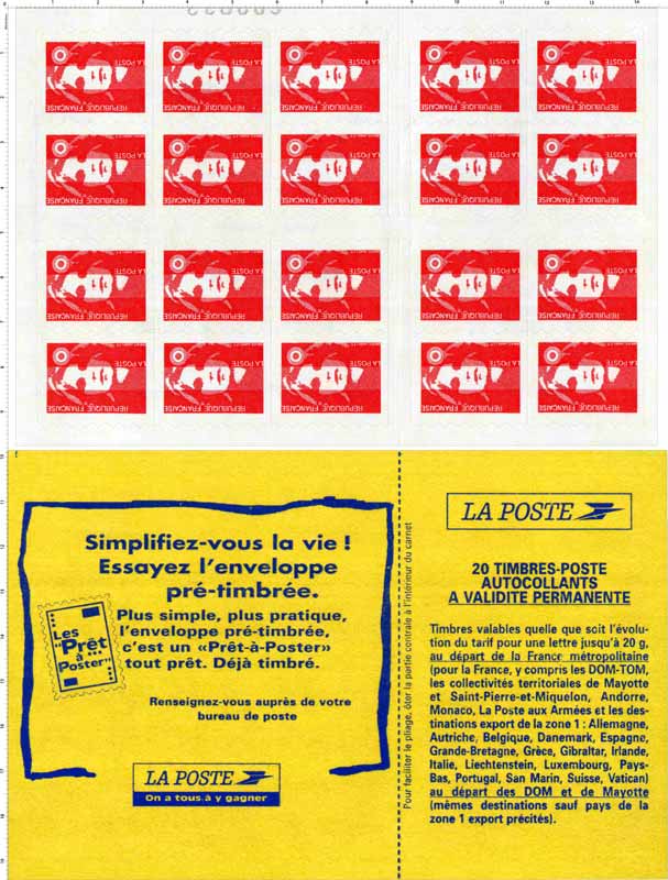 | Commentaire | Carnet pour distributeur automatique de billets de banque. Les timbres de ce carnet sont au type II, c'est le seul carnet des Mariannes du bicentenaire ou Mariannes de Briat qui porte ce type de timbre. Gravure mécanique à partir du poinçon du 4,50 francs rose de 1996. En savoir plus sur Wikipédia : Marianne du Bicentenaire |
