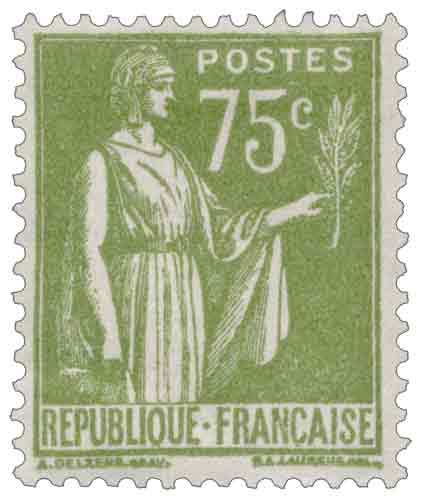 Le 75 centimes olive, émis en septembre 1932, appartient aux valeurs intermédiaires de la série « Paix » initiée à la demande d’André Tardieu pour renouveler les timbres d’usage courant autour d’une iconographie pacifiste forte. Le dessin de Paul-Albert Laurens montre la République apaisée tenant rameau et épée au fourreau, tandis que la gravure d’Antonin Delzers, très précise malgré les aplats délicats de la typographie, confère au motif une remarquable lisibilité. Particularités philatéliquesOn rencontre plusieurs nuances d’olive, du vert olive foncé au jaune-olive plus clair, issues des différents bains d’encre typographiques. La valeur est courante neuve mais plus délicate à trouver parfaitement centrée. Le retrait tardif, intervenu le 18 février 1941, explique sa présence fréquente sur plis de la période de guerre malgré une émission très antérieure. |