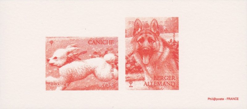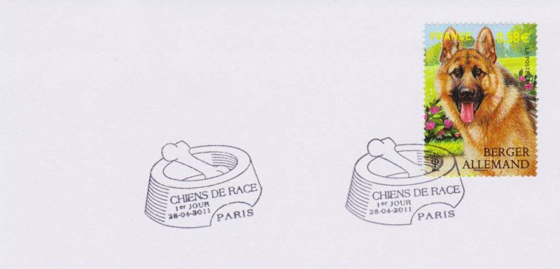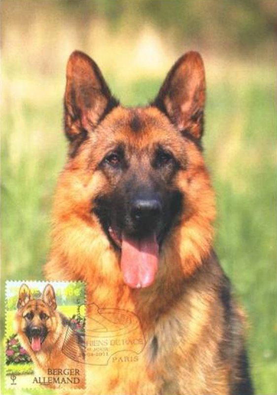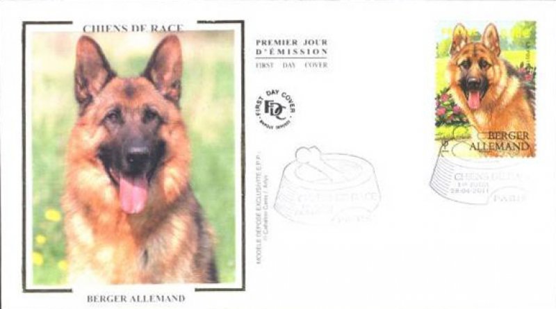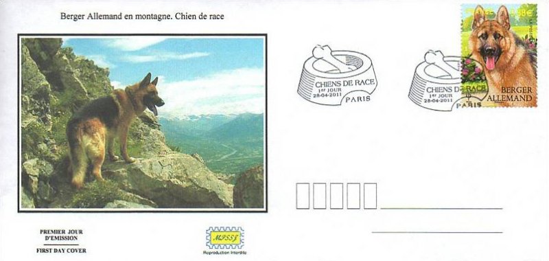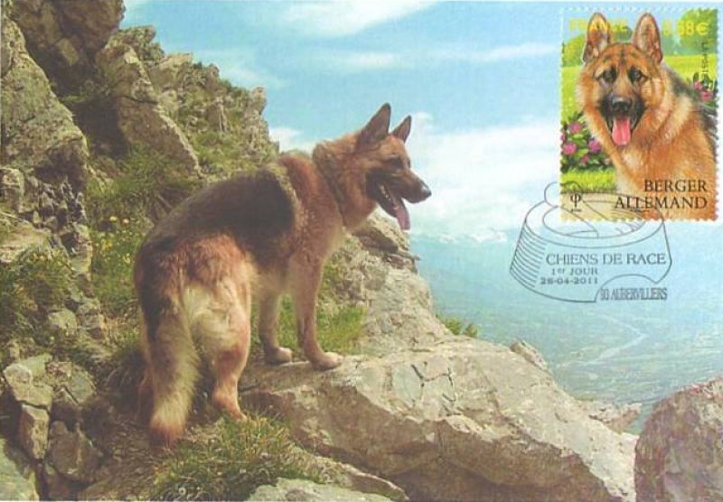 | Commentaire | Quatre chiens de race figurent sur Les timbres du bloc Nature : Le Labrador, le Berger allemand, le Yorkshire et le caniche En 2011, la série “Nature” est consacrée aux chiens de race. Quatre d’entre eux ont été retenus pour illustrer cette série : le labrador, le berger allemand, le yorkshire et le caniche. Le labrador, qu’il soit jaune, chocolat ou noir, est l’un des chiens de compagnie les plus polyvalents. Bon chien de chasse, ainsi que chercheur de drogue, c’est aussi un chien de sauvetage et un guide d’aveugle exceptionnel. Le berger allemand, lui aussi, rend autant de services exceptionnels : chien de garde, guide d’aveugle, sauveteur en montagne, il est souvent aussi chien policier. Timbre à date “Premier Jour” conçu par Jean-Paul Cousin |
