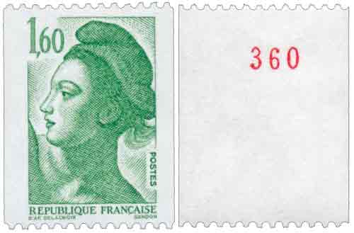 | Commentaire | Roulette de 1000 timbres avec numérotation en rouge tous les 10 timbres au dos. Le premier numéro est 000, le dernier est 010. La gomme est brillante. Existe avec bande phosphorescente à gauche. Existe également sans bande phosphorescente accidentelle |