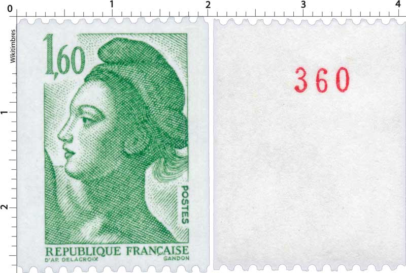| Commentaire | Roulette de 1000 timbres avec numérotation en rouge tous les 10 timbres au dos. Le premier numéro est 000, le dernier est 010. La gomme est brillante. Existe avec bande phosphorescente à gauche. Existe également sans bande phosphorescente accidentelle |