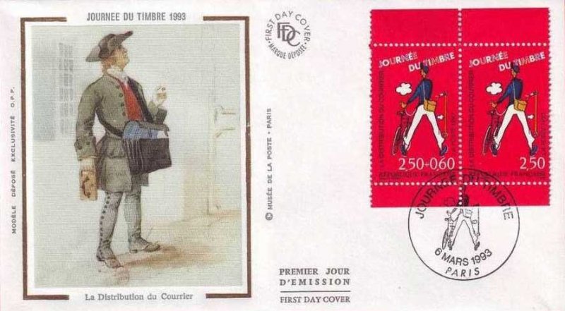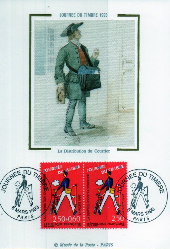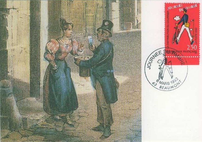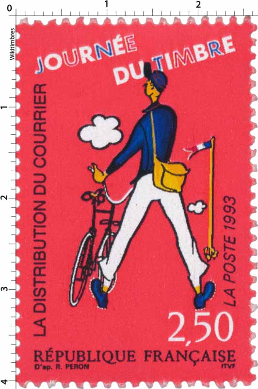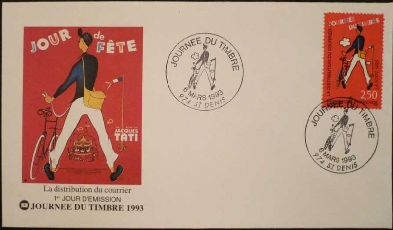 | Description | Journée du Timbre. Les métiers de la Poste. La distribution du courrier, d'après une affiche dessinée pour le film Jour de Fête de Jacques Tati |