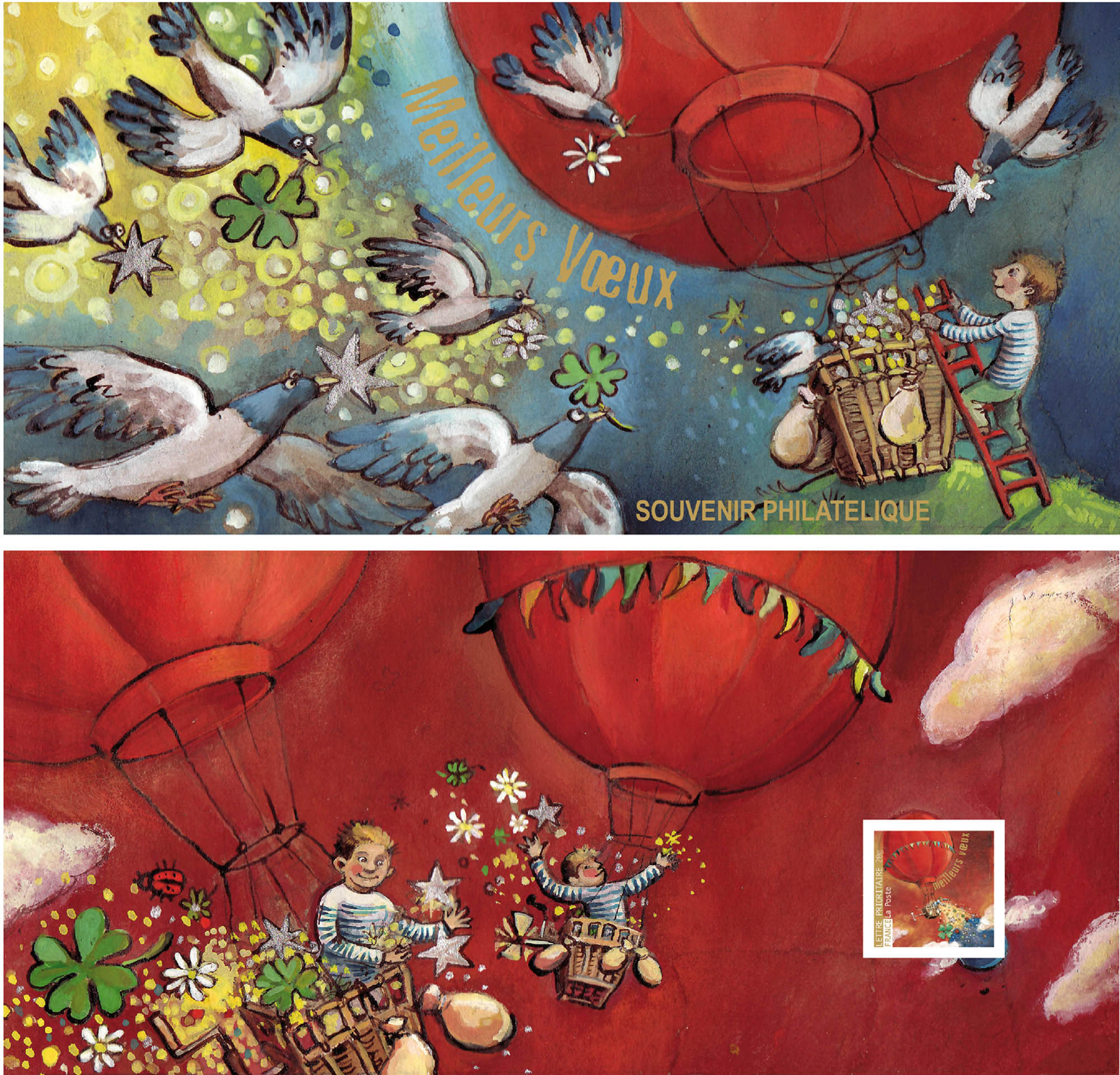| Commentaire | Sur le souvenir Meilleurs vœux, Geneviève Marot raconte une histoire autour du timbre Montgolfière. On y retrouve des trèfles à quatre feuilles et des étoiles, dispersés par des montgolfières, comme une multitude de petites offrandes. |