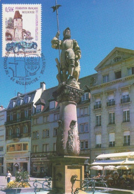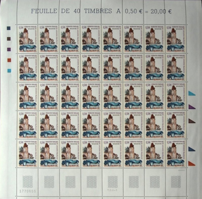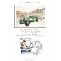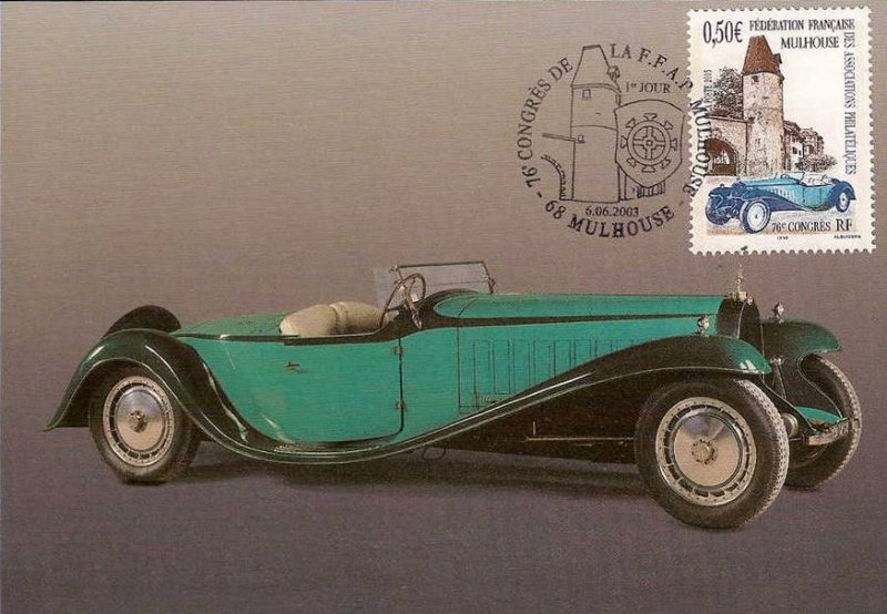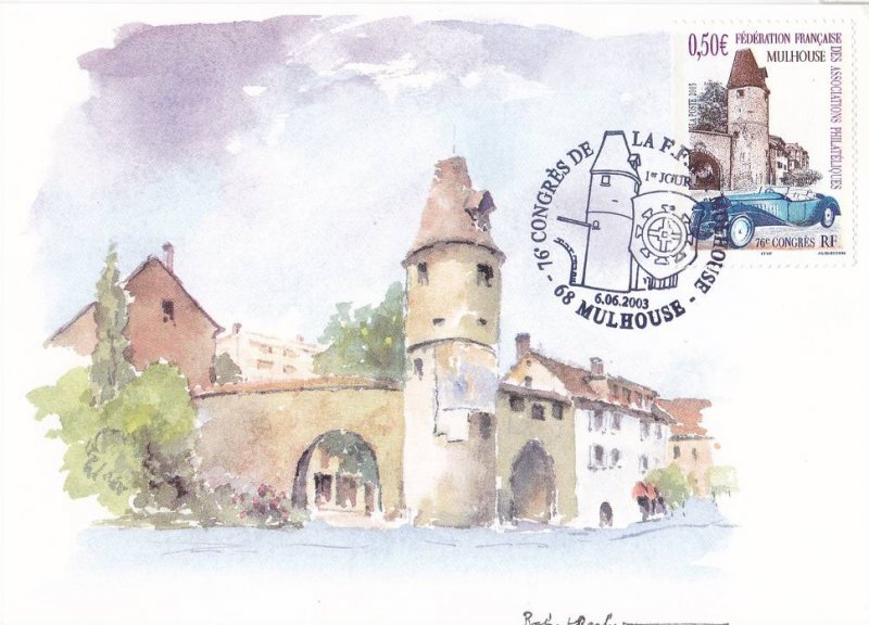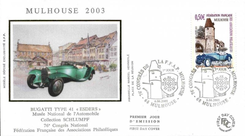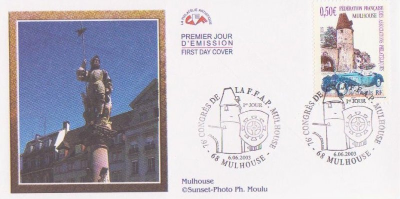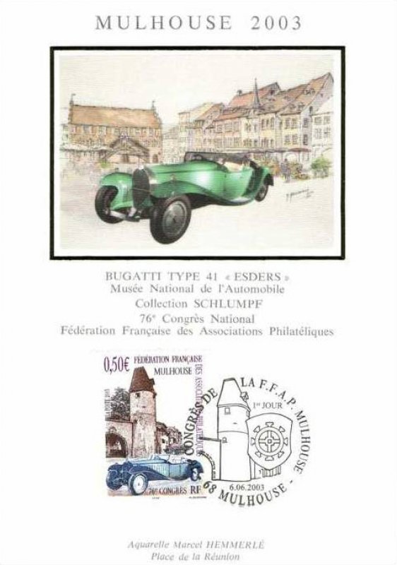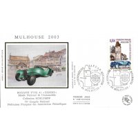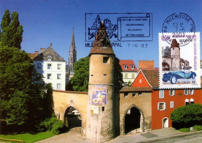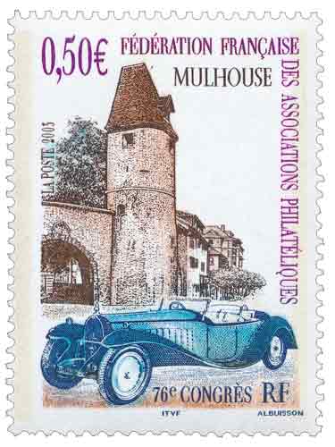 | Commentaire | Description synthétique du visuel du timbre : Mulhouse est située dans la vallée de l’Ill et sur le canal du Rhône au Rhin, à 30 km de Bâle. Elle accueille en 2003 le 76e congrès de la Fédération française des associations philatéliques. La ville possède une très ancienne tradition industrielle dans le textile. Une des grandes figures du textile, Fritz Schlumpf, fut également un grand collectionneur de vieilles voitures, exposées aujourd’hui au musée national de l’automobile. L’une de ces voitures illustre le timbre, associée au Bollwerk, édifice emblématique de Mulhouse, ancien petit bastion de défense du mur d’enceinte, tour demi-ronde encadrée de 2 « portes ». |