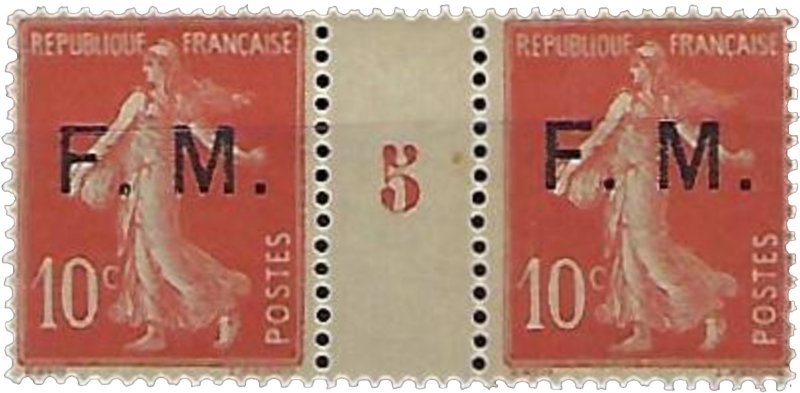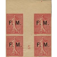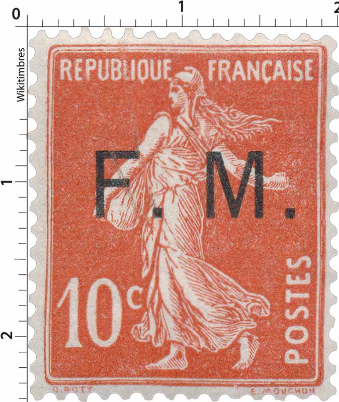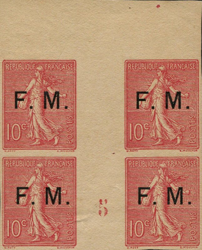 | Commentaire | Impression en planche de 300 timbres Émis sous forme de feuille de 150 TP . Envoyées par les militaires Sous officiers et hommes du rang à raison de 2 timbres par mois pour chaque homme. Retrait le 30 juin 1929, mais utilisation jusqu'à extinction des stocks. En ce qui concerne les couleurs du timbre, il existe de nombreuses nuances : Rouge terne, rouge foncé, rouge orangé, rouge vermillonné, rouge vif, rouge sang etc. (Les feuilles de timbres qui devaient être surchargées FM étaient prises dans les stocks détenus par l'imprimerie des timbres poste, ou des restes de tirage qui n'avaient pas été distribués aux différents bureaux de poste ce qui explique la variété des nuances) Voir la vidéo "Histoires de timbres" |