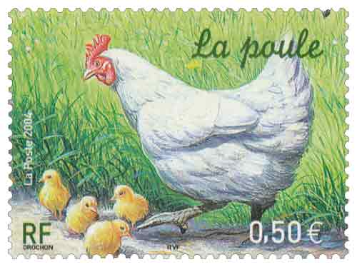 | Commentaire | La poule est toujours un animal bien présent dans les cours de ferme et on la qualifie souvent de reine de la basse cour. Les premières races apparues en Europe avant l’ère chrétienne se sont depuis considérablement diversifiées. La Bresse gauloise, figurant sur le timbre entourée de ses poussins, peut atteindre 2,5 kg |