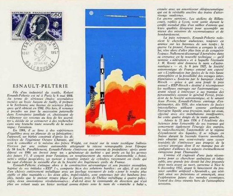 | Description | 10e anniversaire de la mort de Robert Esnault-Pelterie (1881-1957), ingénieur aéronautique, pionnier de la théorie des vols spatiaux, né à Paris. |