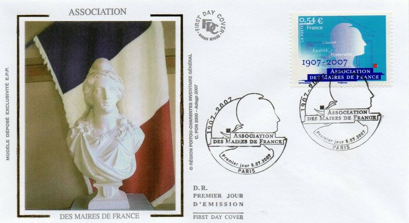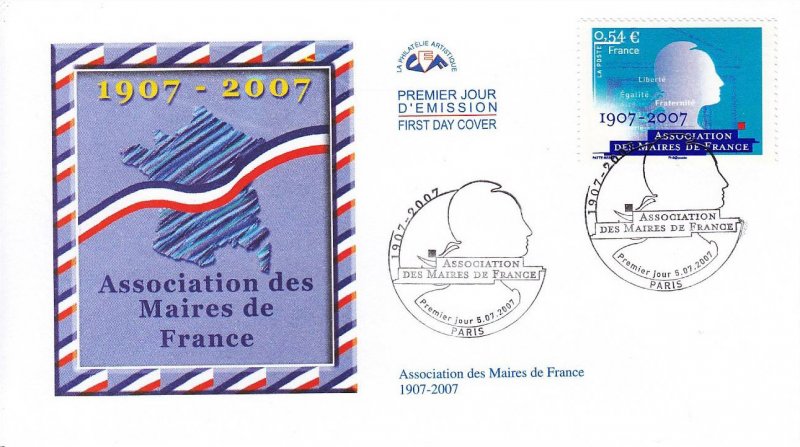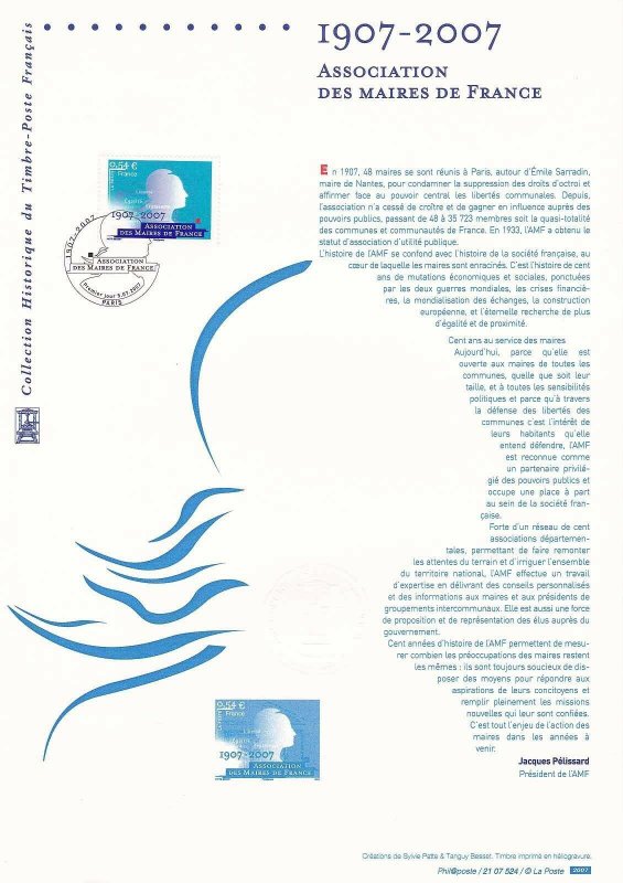 | Commentaire | 2007 l’Association des Maires de France commémore son centenaire. Parce qu’elle est unie elle dégage un réel consensus sur les valeurs de démocratie, de citoyenneté et de proximité qui fondent le socle de l’institution communale. Ses 36 000 adhérents lui confèrent une incontestable légitimité. |