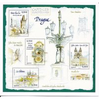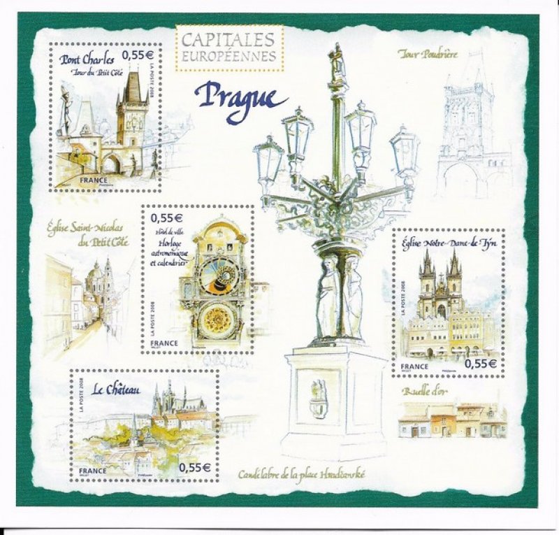 | Commentaire | Prague, est mise à l’honneur en 2008 dans la série des Capitales européennes, sous forme de bloc traité dans un style carnet de voyage. Capitale de la république tchèque, Prague, dont le centre historique est inscrit au patrimoine mondial de l’Unesco, est la ville de tous les styles artistiques : roman, gothique, baroque, art nouveau, cubiste …. A ne pas manquer, le Château de Prague, monument culturel national, le Pont Charles le pont le plus ancien de Prague, et ses Tours – dont la Tour du Petit Côté, l’ Hôtel de Ville, son horloge et son calendrier, l’église Notre-Dame-de-Tỷn, la Tour Poudrière, entrée monumentale de la Vieille Ville, la Cathédrale Saint-Nicolas du Petit Côté, la Ruelle d’or et ses maisonnettes construites dans les fortifications gothiques, les candélabres à l’entrée du château … contribuent tous à l’attrait de cette ville. |