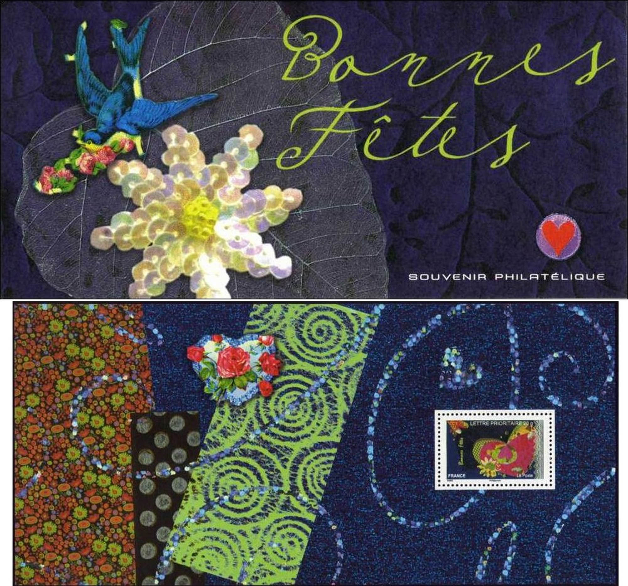 | Commentaire | Dans le cadre de l’émission d’un carnet de 14 timbres-poste autocollants sur le thème des fêtes de fin d’année, La Poste a repris sous forme de feuillet gommé un de ces timbres. Ce timbre repose sur un fond de différents collages. Timbre sans millésime |