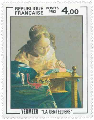 Ce timbre reproduit La Dentellière, œuvre peinte entre 1664 et 1675 par Johannes Vermeer et conservée au musée du Louvre, tableau emblématique de la peinture hollandaise du XVIIᵉ siècle. L’émission de 1982 s’inscrit dans la politique culturelle française de valorisation des chefs-d’œuvre des collections nationales à travers la série dite du « Musée imaginaire », qui vise à diffuser largement des références majeures de l’histoire de l’art. Le choix de Vermeer, artiste longtemps méconnu hors de son pays avant sa redécouverte au XIXᵉ siècle, souligne l’attention portée par l’administration postale à des figures essentielles de la peinture européenne dont l’influence dépasse les frontières nationales. La Dentellière illustre la place singulière de Vermeer dans le Siècle d’or néerlandais : une peinture de l’intériorité et du silence, fondée sur une observation minutieuse de la lumière et des gestes quotidiens, loin des scènes historiques ou spectaculaires. En mettant à l’honneur ce tableau de très petit format, ce timbre rappelle également le rôle du musée du Louvre comme dépositaire d’œuvres étrangères majeures intégrées au patrimoine culturel français depuis le XIXᵉ siècle. L’émission de 1982 contribue ainsi à inscrire la philatélie française dans une démarche pédagogique et patrimoniale, en établissant un lien direct entre histoire de l’art, collections publiques et diffusion postale. Ce timbre participe enfin à la reconnaissance populaire d’un peintre dont l’œuvre, rare et précieuse, est aujourd’hui considérée comme l’une des plus accomplies de la peinture de genre européenne. |