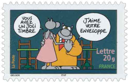 | Description | Sourires avec le chat du dessinateur Philippe Geluck : Vous avez un joli timbre, j'aime votre enveloppe |