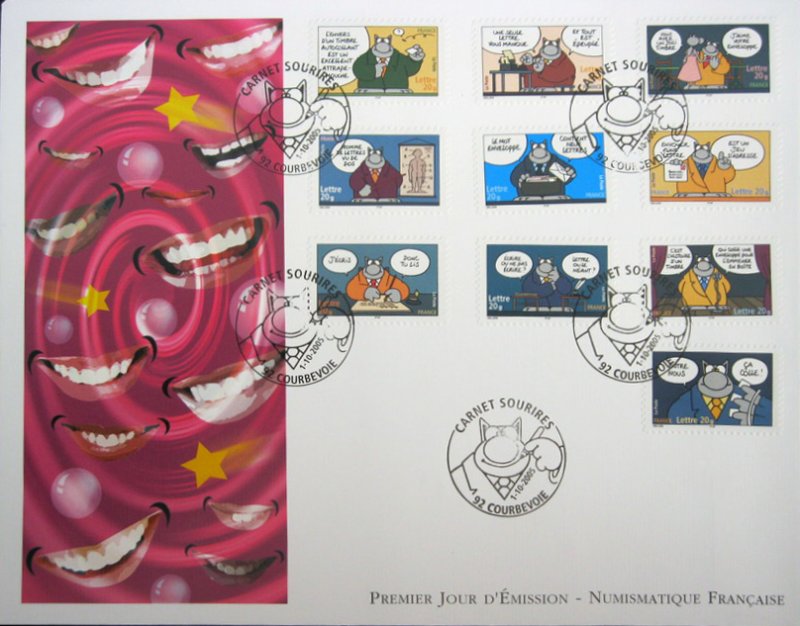 | Description | Sourires avec le chat du dessinateur Philippe Geluck : Vous avez un joli timbre, j'aime votre enveloppe |