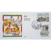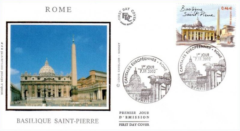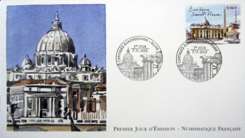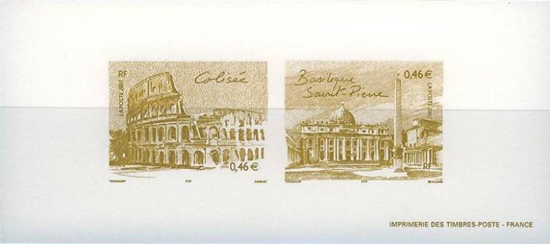 | Commentaire | Description synthétique du visuel du timbre : En 2002 débute une nouvelle série de timbres dédiée aux capitales européennes. A plus d’un titre, Rome mérite d’inaugurer cette série. Elle est notamment la ville dans laquelle ont été signés, le 25 mars 1957, les traités de Rome qui ont donné naissance à la Communauté Économique Européenne (CEE) et à la Communauté Européenne de l’Énergie Atomique (EURATOM). Réalisé en aquarelle, ce premier bloc présente des monuments de Rome dans un style évoquant les carnets de voyage. Le Colisée, la basilique Saint-Pierre, la fontaine de Trevi et l’église de la Trinité-des-Monts illustrent les timbres. L’église Notre-Dame-de-Lorette, la colonne Trajane, la bouche de la vérité et un détail de la fontaine du Maure sur la place Navone agrémentent le fond du bloc. Émis uniquement en feuillet |