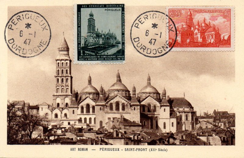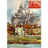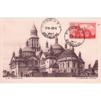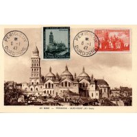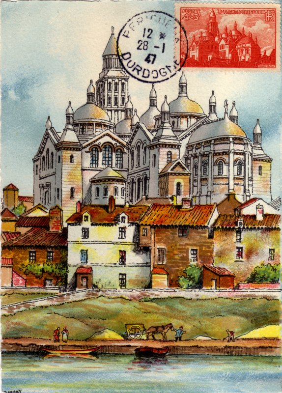 | Commentaire | Visuel : la cathédrale Saint-Front, située dans le centre de la ville, de Périgueux, est classée monument historique depuis 1840 et au patrimoine mondial de l'UNESCO depuis 1998, au titre des Chemins de Saint-Jacques-de-Compostelle, sur la "Via Lemovicensis" (de Vézelay) en France. Construite entre 1125 et1150, Saint-Front fut d'abord église abbatiale, puis collégiale et devint cathédrale en 1669, à la suite de la mutilation de la cathédrale primitive Saint-Etienne. L'église à coupoles du XIIe siècle a été érigée en basilique mineure en 1897. Dominant la ville par-dessus la rivière l'Isle, elle tient son originalité de son architecture particulière, exemple rare en France, d’une église en forme de croix grecque. Elle fût remaniée de nombreuses fois pour être entièrement restaurée (presque reconstruite) par l’architecte Paul Abadie (1812-1884) à la fin du XIXe siècle. Elle subira encore quelques modifications par la suite. Elle reste aujourd’hui un magnifique témoignage de l’art roman -byzantin avec ses deux nefs, chacune divisée en trois travées, ses cinq coupoles, dominées par l’imposant clocher de 67 mètres qui date du XIIe siècle, et les 23 clochetons qui ne sont pas sans rappeler l’église Saint Marc de Venise. |