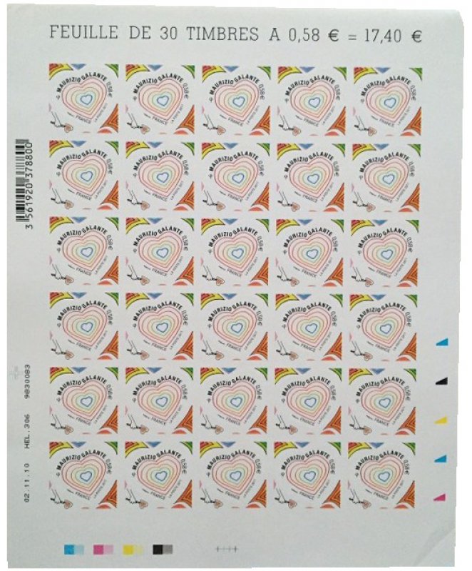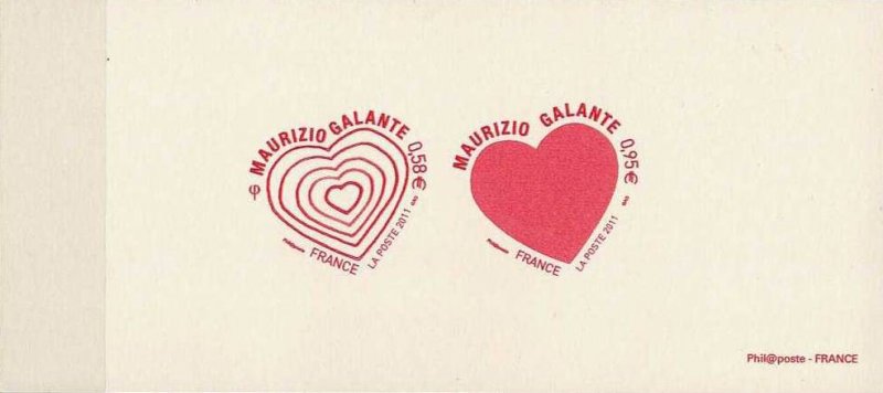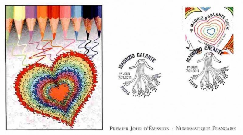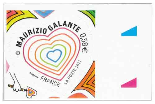 | Commentaire | Existe également sur papier gommé. Maurizio Galante a créé 2 timbres audacieux pour illustrer les cœurs griffés 2011. Le timbre à 0,58 € est à colorier à sa guise. C’est un appel à la créativité, chacun devenant l’auteur de son timbre. Timbre à date “Premier Jour” conçu par Maurizio Galante