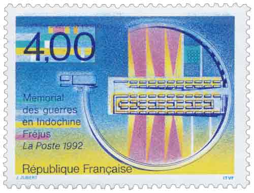| Commentaire | Erreur sur le millésime du timbre Au début des années 1990, la mémoire des conflits liés à l’Indochine française fait l’objet d’une reconnaissance officielle renouvelée. La création de la nécropole nationale de Fréjus s’inscrit dans ce mouvement mémoriel destiné à rassembler et honorer les soldats français morts en Indochine entre 1940 et 1954. Après un accord conclu le 2 août 1986 entre la France et le Vietnam, les dépouilles de milliers de militaires jusque-là inhumés dans plusieurs cimetières vietnamiens sont rapatriées en France. Entre 1986 et 1987, 24 020 corps sont transférés puis réinhumés dans ce mémorial situé dans le département du Var. Inauguré officiellement le 16 février 1993 par le président de la République François Mitterrand, le site constitue un lieu de recueillement national consacré aux soldats « Morts pour la France » durant les guerres d’Indochine. L’ensemble architectural, conçu par l’architecte Bernard Desmoulin, adopte une forme circulaire d’environ 115 mètres de diamètre organisée autour d’une crypte centrale et d’un espace mémoriel ouvert. Le Mur du Souvenir y porte les noms des disparus dont les tombes n’ont pas été retrouvées, tandis qu’un ossuaire rassemble les restes de combattants non identifiés. L’aménagement du mémorial combine architecture monumentale et symbolique du souvenir, afin de rappeler le sacrifice des soldats engagés dans ces conflits lointains. Par son émission en 1993, l’administration postale française inscrit cette inauguration dans la politique commémorative nationale et rappelle, à travers ce timbre, l’importance accordée à la mémoire militaire et au devoir de souvenir envers les combattants disparus. Article rédigé pour WikiTimbres |