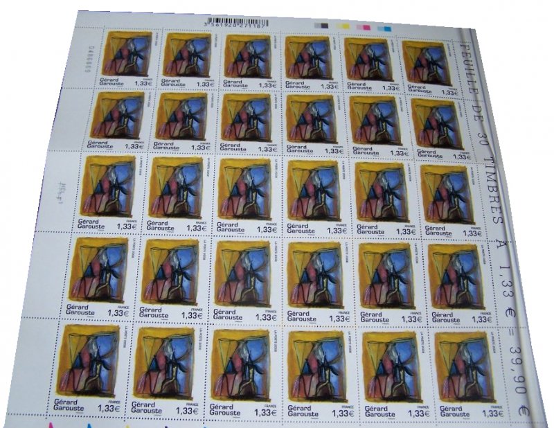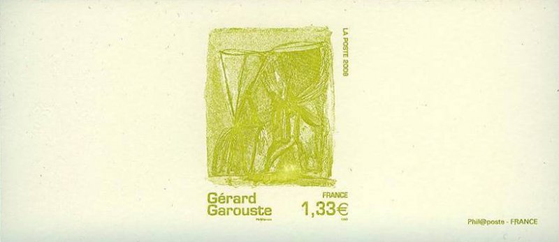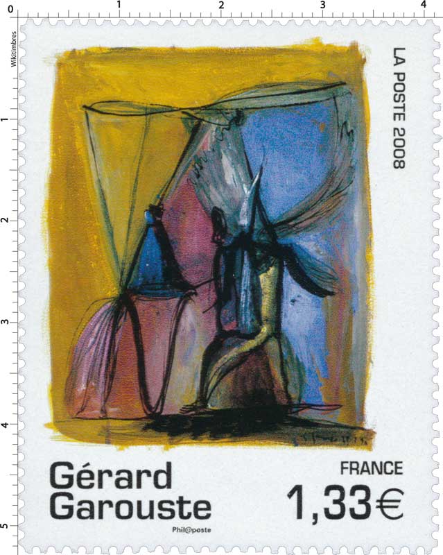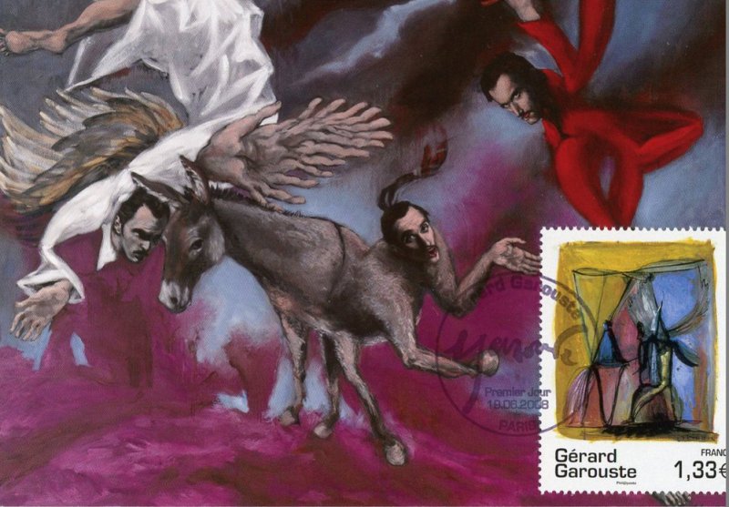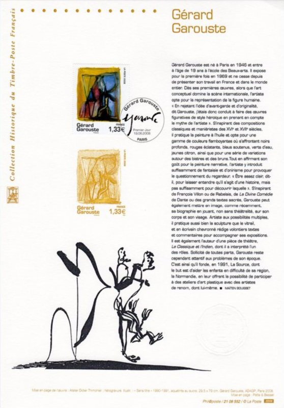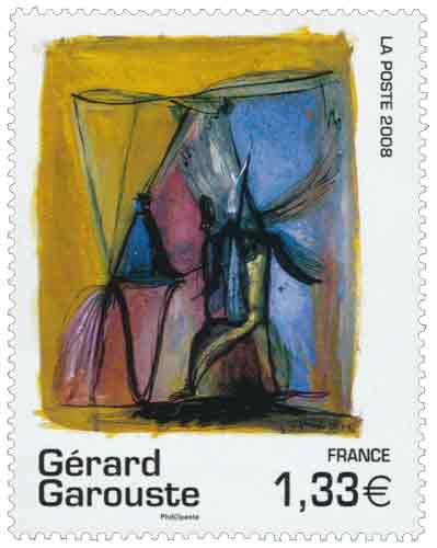 | Commentaire | Existe également en autoadhésif. La mise en vente anticipée a lieu du 19 au 22 juin au Salon du timbre, à Paris. La signature de l'artiste est inséré dans une oblitération premier jour par Bruno Ghiringhelli Gérard Garouste est né à Paris en 1946. Après des études aux Beaux-arts, il réal |