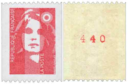 | Commentaire | Roulette de 1000 timbres-poste avec numérotation en rouge au dos tous les 5 timbres. Le premier numéro est 000, le dernier est 005. En savoir plus sur Wikipédia : Marianne du Bicentenaire |