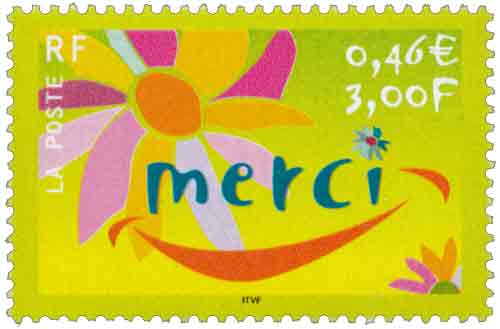 | Commentaire | Description synthétique du visuel du timbre : Une fleur, symbole du remerciement, illustre le timbre dans un style moderne aux couleurs très fraîches. La feuille a été interprétée pour évoquer un sourire, ce qui confère à ce visuel un caractère susceptible de séduire les entreprises. Timbre sans millésime |