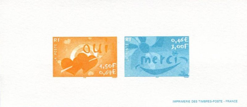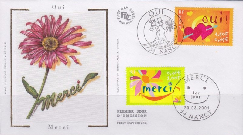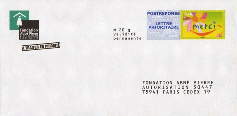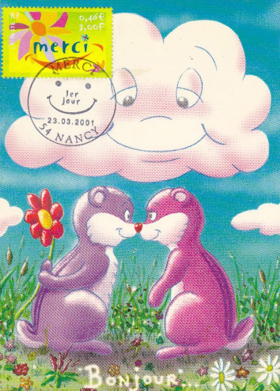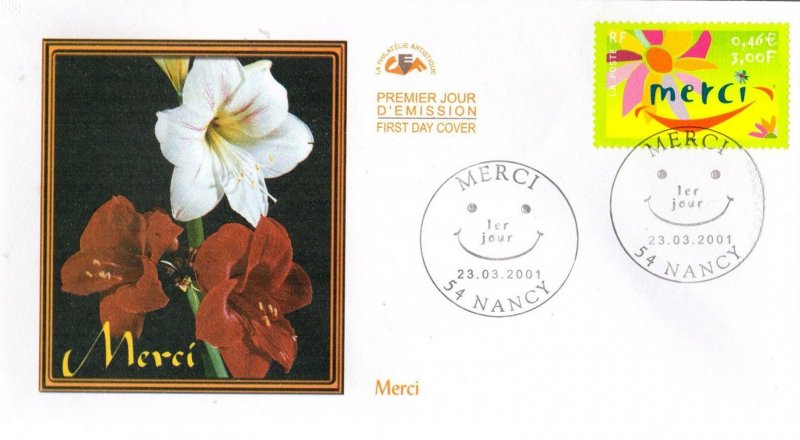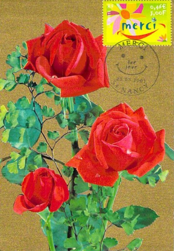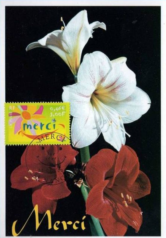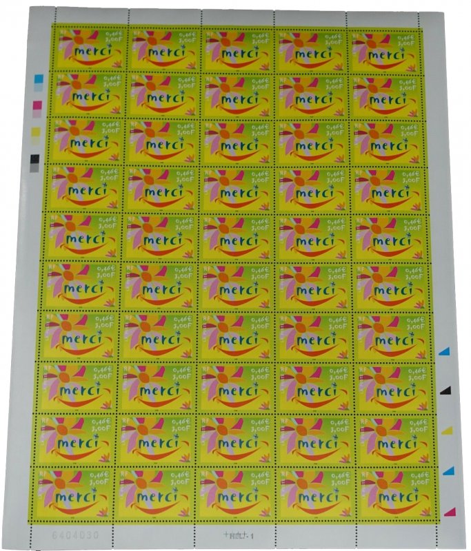 | Commentaire | Description synthétique du visuel du timbre : Une fleur, symbole du remerciement, illustre le timbre dans un style moderne aux couleurs très fraîches. La feuille a été interprétée pour évoquer un sourire, ce qui confère à ce visuel un caractère susceptible de séduire les entreprises. Timbre sans millésime |