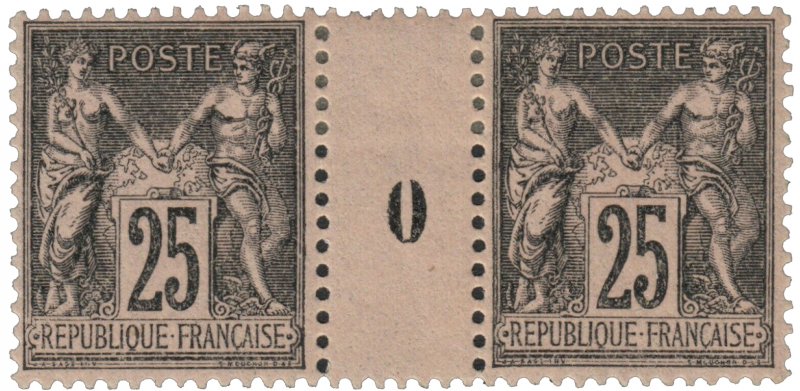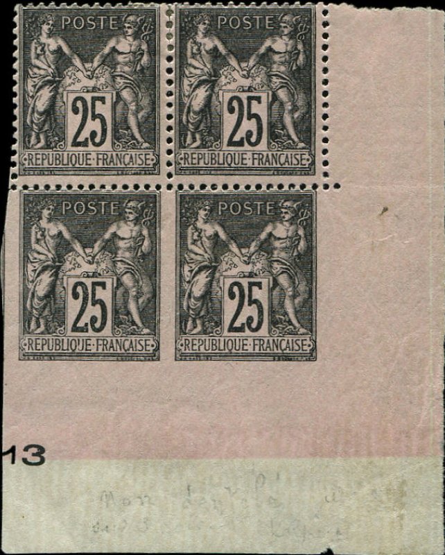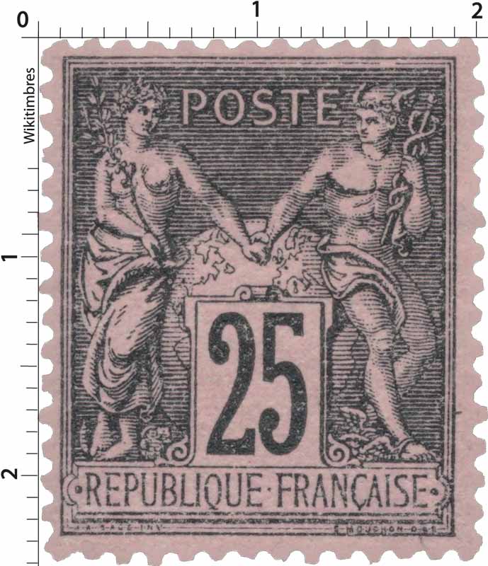 | Commentaire | Sage. Type II (N sous U). Retrait fin 1900 En savoir plus sur Wikipédia : Type sage ou allégorie de la Paix et le Commerce s’unissant Paru en avril 1886, le timbre Sage type II de 25 centimes noir sur rose remplace le 25 c bistre sur jaune (n°92) afin d’adapter la série à la création des cartes-lettres. Cette nouvelle couleur permet d’éviter toute confusion chromatique avec les autres valeurs postales en usage dans le régime étranger de l’UPU. La nuance rose, plus ou moins soutenue selon les tirages, offre plusieurs variations authentiques recherchées dans la famille des timbres classiques français de la période 1876-1900. En oblitéré, les cachets à date des bureaux expédiant du courrier international sont les plus courants ; les plis réels vers l’étranger ou les Colonies restent les pièces les plus représentatives de l’usage postal du 25 centimes à cette époque. Aucun faux d’époque notable n’est connu pour cette émission, et elle ne fait pas partie des réimpressions Granet. Ce 25 c noir sur rose constitue l’un des repères importants de la fin de la série Sage type II. |