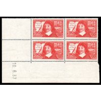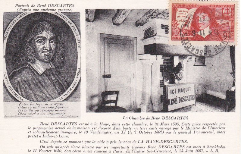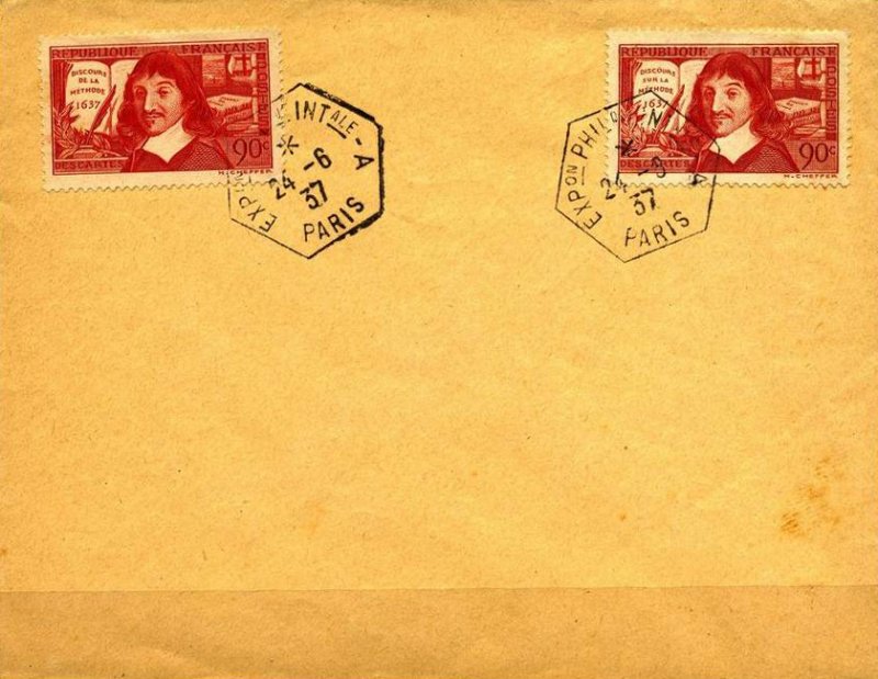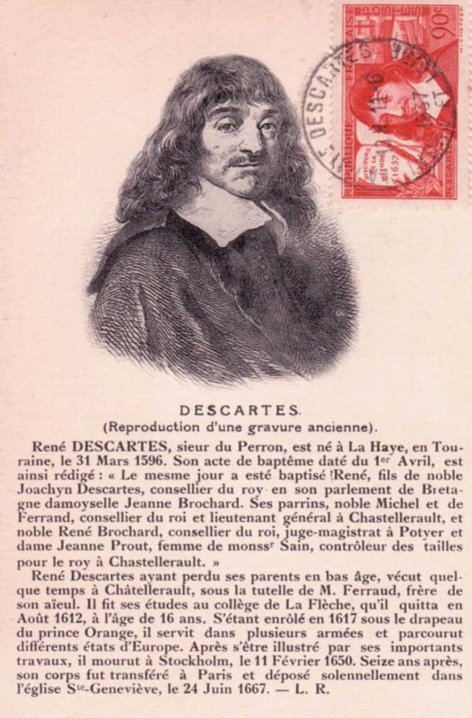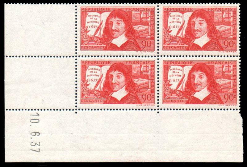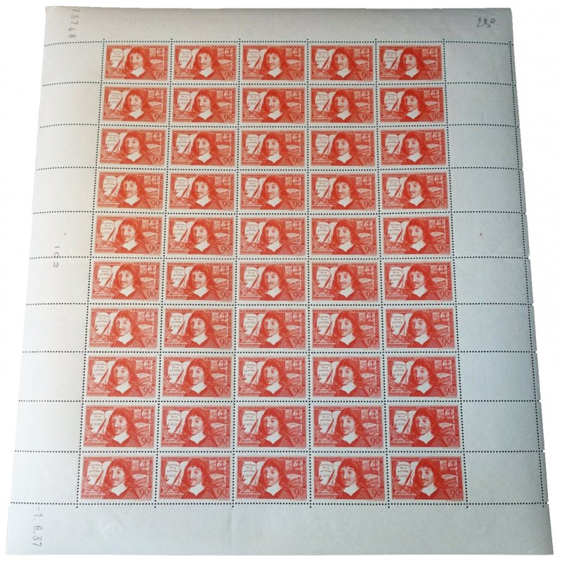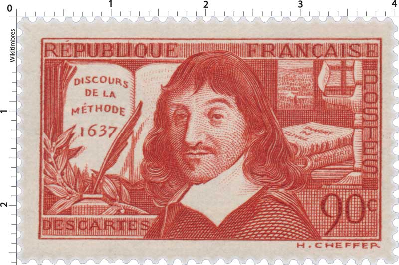 | Commentaire | Descartes - Discours de la méthode 1637. Voir la vidéo : Histoires de timbres Émis le 10 juin 1937 en taille-douce rotative, ce timbre horizontal rouge foncé célèbre le tricentenaire (1637-1937) du "Discours de la Méthode" de René Descartes (1596–1650), philosophe, scientifique et mathématicien. Le timbre rend hommage à l'une des figures fondatrices de la pensée occidentale, incarnée par le célèbre Cogito ergo sum. Le motif, dessiné et gravé par Henry Cheffer d'après un portrait de Frans Hals, met en évidence la diversité des travaux de Descartes en incluant en arrière-plan ses ouvrages "Traité de l'homme" et "La géométrie" (introduisant les coordonnées cartésiennes). La première version de ce timbre contenait une erreur, mentionnant "Discours sur la méthode" au lieu de "de la méthode", rapidement corrigée par la Poste. D'une valeur faciale de 90 centimes, ce timbre était destiné à l'affranchissement de la lettre double pour l'intérieur à partir de juillet 1937. Émis à 5 millions d’exemplaires, il fut retiré en août 1937, conférant une courte durée de vie à cette émission commémorative majeure. |