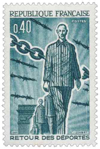 Émis en France en 1965 pour le vingtième anniversaire de la fin de la Seconde Guerre mondiale, le timbre commémoratif intitulé « Retour des déportés » se distingue par la volonté explicite des autorités postales de dissocier la mémoire de la Victoire de celle, spécifique et irréductible, de la déportation, afin de rappeler que celle-ci constitue non seulement une conséquence du conflit mais surtout une négation radicale de toute humanité, marquée par l’univers concentrationnaire et les crimes de masse découverts en 1944 et 1945 ; le sujet retenu évoque le retour des survivants sur le sol français au printemps 1945, moment à la fois de libération et de deuil, lorsque les rescapés, affaiblis mais dignes, défilèrent à Paris pour honorer la mémoire de leurs compagnons disparus, et s’inscrit ainsi dans une politique commémorative française cherchant à transmettre une mémoire lucide, sobre et pédagogique des tragédies du XXe siècle ; par son traitement graphique volontairement dépouillé et sa gravure en taille-douce, ce timbre de France affirme une fonction mémorielle et civique plus qu’illustrative, rappelant la place du timbre-poste comme vecteur durable de mémoire collective et de transmission historique. |