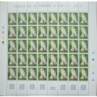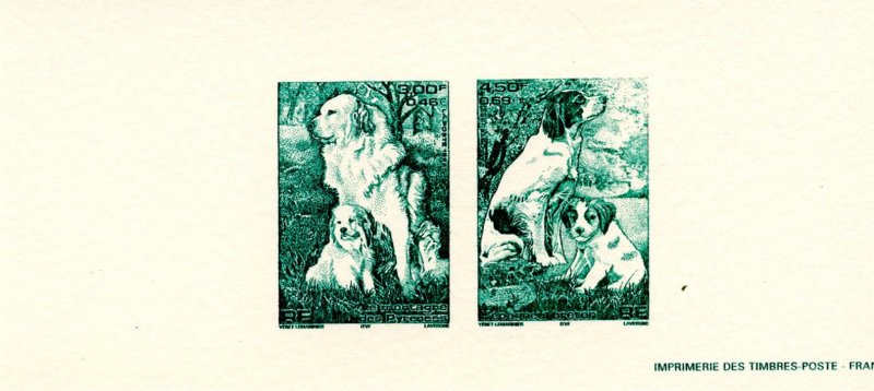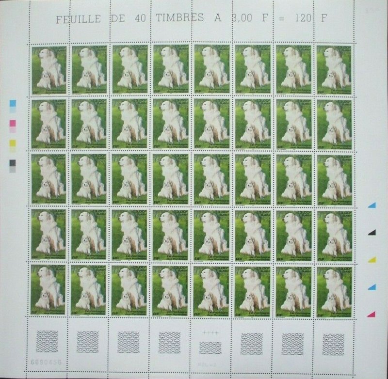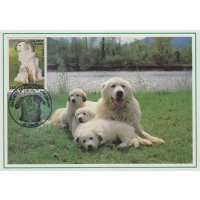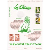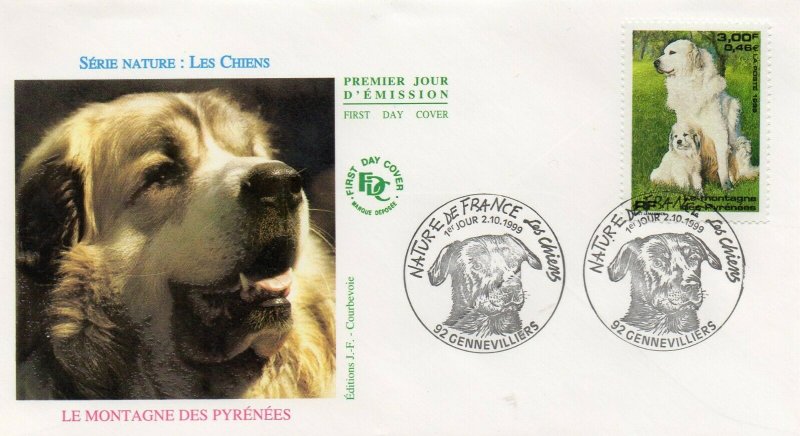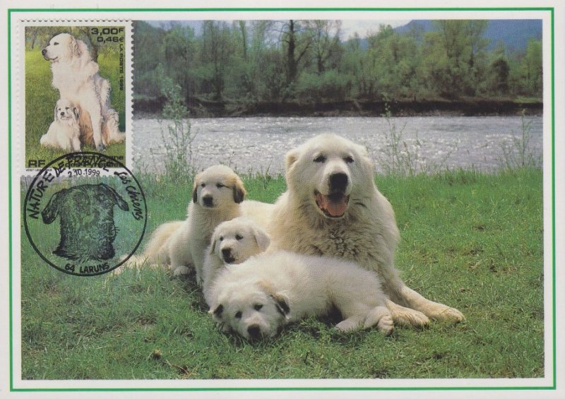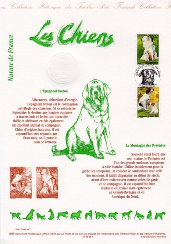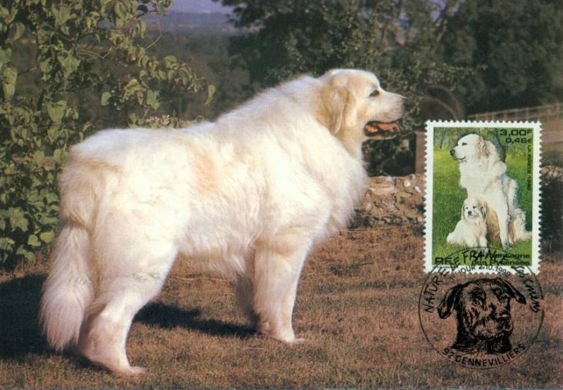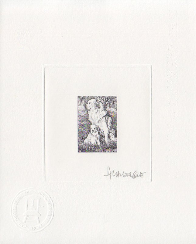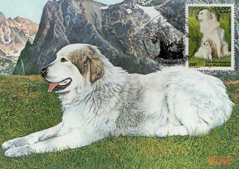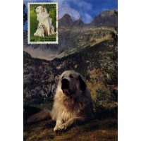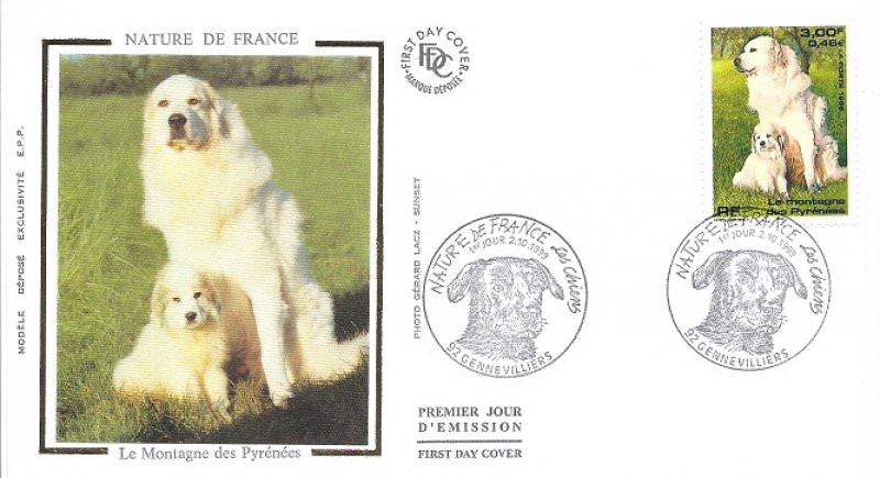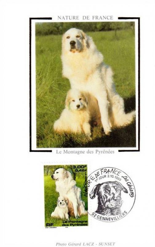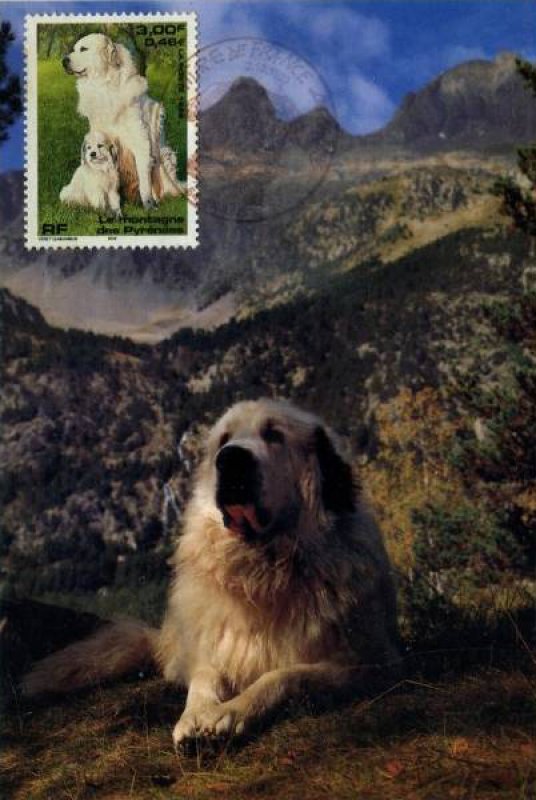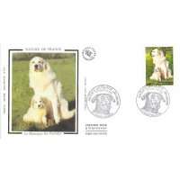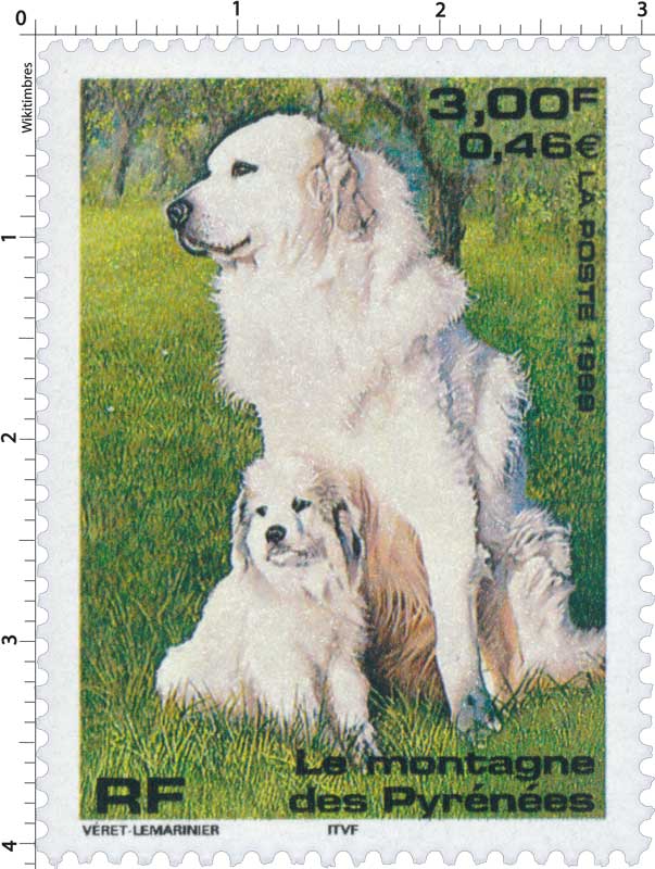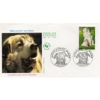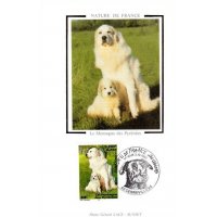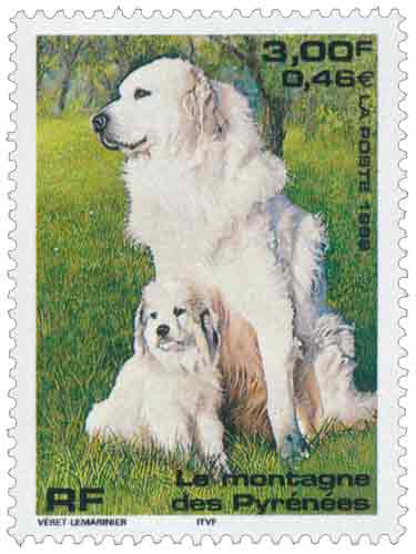 | Commentaire | Description synthétique du visuel du timbre : Le montagne des Pyrénées est un chien de taille imposante, de couleur blanche, au poil abondant, long et plat qui lui confère beauté et élégance. Très équilibré, il possède une vive intelligence et une douce expression. La patience, la noblesse et le courage caractérisent cette race. Il figure sur le visuel, en compagnie de son chiot, assis dans une prairie aux couleurs printanières. |