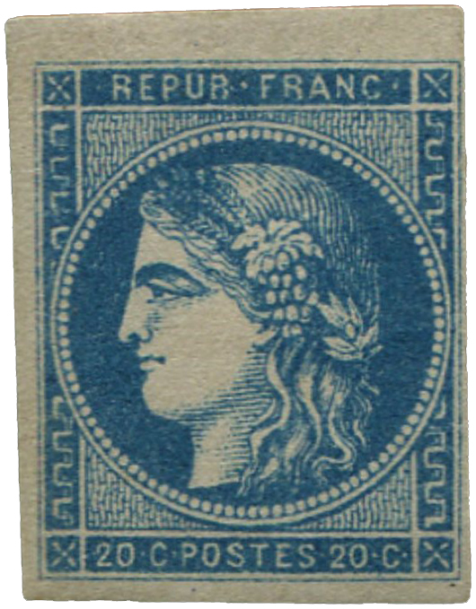 | Commentaire | Cérès - Émission de Bordeaux. Type II - Report 2. Le 20 centimes bleu, n°45B, appartient à l’Émission de Bordeaux, produite dans l’urgence durant l’hiver 1870 alors que Paris est assiégé et que les ateliers officiels ne peuvent plus approvisionner le territoire non envahi. Après les difficultés rencontrées avec le type I de Dambourgez, trop fin pour être correctement imprimé en lithographie, la réalisation du nouveau modèle est confiée à Léopold Yon, qui grave directement sur pierre le dessin du type II, plus adapté aux contraintes techniques. Émis le 6 décembre 1870, le 20c type II existe en plusieurs reports, dont le report 2 représenté par le n°45B. Chaque report correspond à un nouvel état de la pierre lithographique, créée ou retouchée en raison de son usure rapide. Les caractéristiques du type II — notamment les seconds grains de raisin blancs des 1re et 3e rangées et le premier lobe atténué de la feuille de vigne droite — servent de base à l’identification, mais les différences entre reports sont souvent subtiles et tiennent à la qualité du transfert et aux conditions d’impression. L’Émission de Bordeaux, avec la coexistence de plusieurs types, reports et nuances, offre un terrain d’étude particulièrement riche pour les collectionneurs. Le 45B illustre l’un des états intermédiaires du type II, marqué par les contraintes d’une fabrication improvisée. |