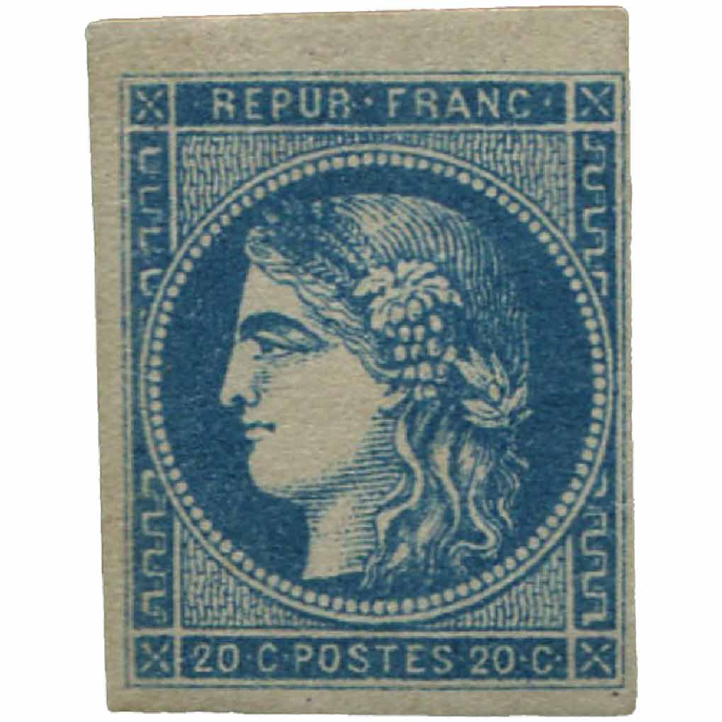 | Commentaire | Cérès - Émission de Bordeaux. Type II - Report 2. Le 20 centimes bleu, n°45B, appartient à l’Émission de Bordeaux, produite dans l’urgence durant l’hiver 1870 alors que Paris est assiégé et que les ateliers officiels ne peuvent plus approvisionner le territoire non envahi. Après les difficultés rencontrées avec le type I de Dambourgez, trop fin pour être correctement imprimé en lithographie, la réalisation du nouveau modèle est confiée à Léopold Yon, qui grave directement sur pierre le dessin du type II, plus adapté aux contraintes techniques. Émis le 6 décembre 1870, le 20c type II existe en plusieurs reports, dont le report 2 représenté par le n°45B. Chaque report correspond à un nouvel état de la pierre lithographique, créée ou retouchée en raison de son usure rapide. Les caractéristiques du type II — notamment les seconds grains de raisin blancs des 1re et 3e rangées et le premier lobe atténué de la feuille de vigne droite — servent de base à l’identification, mais les différences entre reports sont souvent subtiles et tiennent à la qualité du transfert et aux conditions d’impression. L’Émission de Bordeaux, avec la coexistence de plusieurs types, reports et nuances, offre un terrain d’étude particulièrement riche pour les collectionneurs. Le 45B illustre l’un des états intermédiaires du type II, marqué par les contraintes d’une fabrication improvisée. |