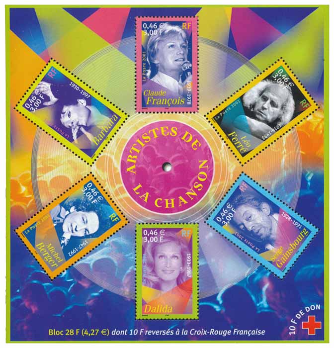 | Commentaire | Description synthétique du visuel du timbre : Les 6 timbres sont disposés dans le bloc de façon circulaire et épousent les contours d’un CD. Le fond du bloc évoque la foule et l’ambiance des concerts. Ambiance accentuée par la présence de faisceaux de projecteurs dont le principe est également repris sur chacun des visuels de timbres. |